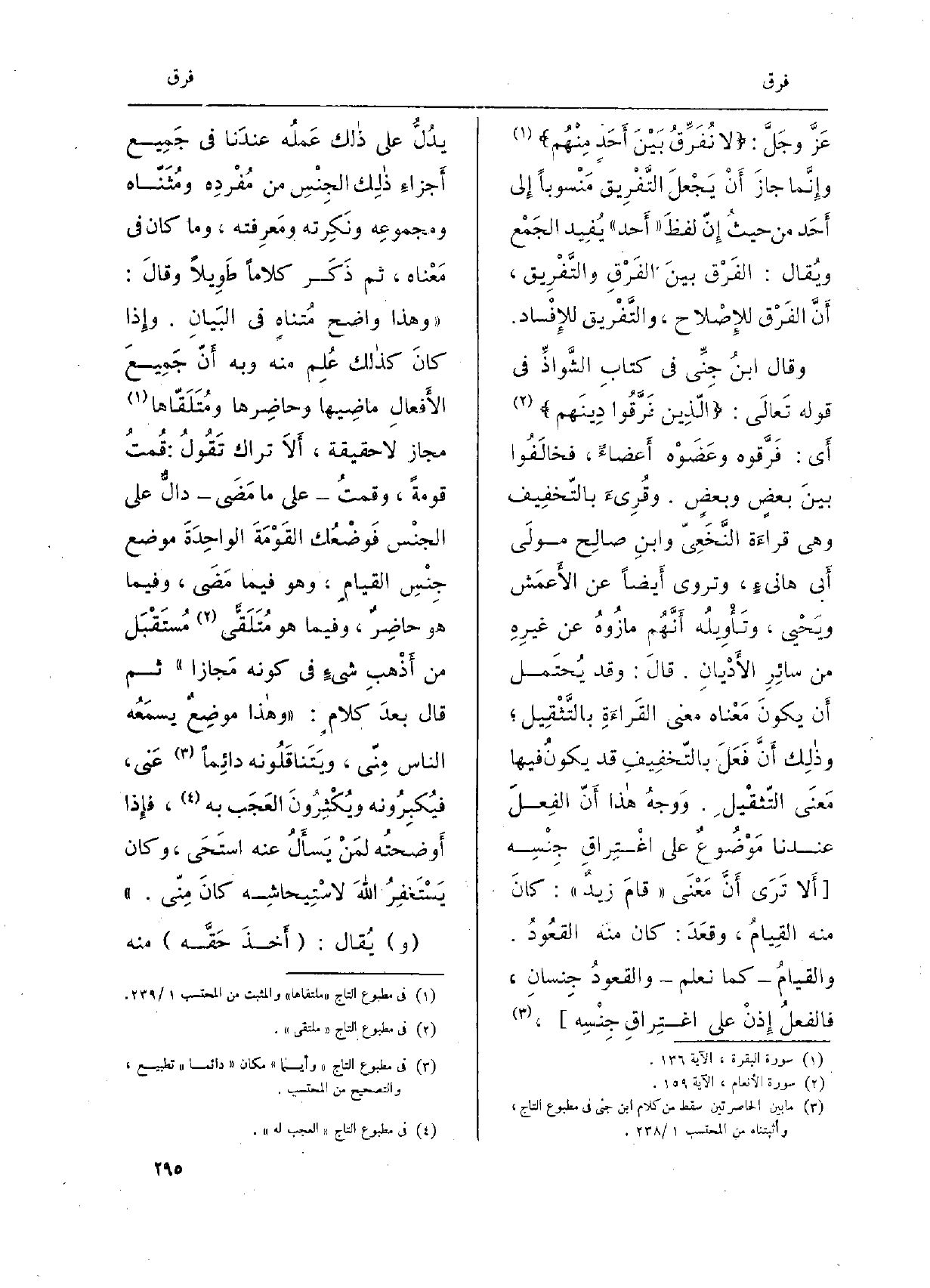 عزّ وجلّ:) لَا نُفَرِّقُ بيْن أحَدٍ منْهُم (وإنّما جازَ أَن يجعلَ التّفريق منْسوباً الى أحَد من حيثُ إنّ لفظَ أحد يُفيد الجمْع ويُقال: الفَرْق بينَ الفَرْقِ والتّفْريق، أنّ الفَرْق للإصلاح، والتّفْريق للإفْساد. وَقَالَ ابْن جِنّي فِي كتابِ الشّواذِّ فِي قَوْله تَعَالَى:) الَّذين فرّقوا دينَهم (أَي: فرّقوه وعَضَوْه أَعْضَاء، فخالَفوا بينَ بعضٍ وَبَعض. وقُرِئَ بالتّخفيف وَهِي قراءَة النّخَعيّ وابنِ صالِح مولَى أبي هانئٍ، وتروى أَيْضا عَن الأعمَش ويَحْيى، وتأْويلُه أنّهُم مازُوهُ عَن غيرِه من سائِرِ الأدْيان. قَالَ: وَقد يُحتَمل أَن يكون معْناه معنى القَراءَة بالتّثْقيل وذلِك أنّ فَعَل بالتّخفيفِ قد يكون فِيهَا مَعنَى التّثقيل. ووجهُ هَذَا أنّ الفِعلَ عندنَا موضوعٌ على اغْتِراقِ جِنْسِه أَلا ترى أنّ معْنى قامَ زيدٌ: كَانَ مِنْهُ القِيام، وقعَدَ: كَانَ مِنْهُ القُعود. والقيامُ كَمَا نعلم والقُعودُ جِنسان، فالفعلُ إذنْ على اغتِراقِ جنسِه، يدُلُّ على ذَلِك عملُه عندَنا فِي جَمِيع أجزاءِ ذلِك الجِنْسِ من مُفردِه ومُثنّاه ومجموعِه ونَكِرته ومَعرِفته، وَمَا كَانَ فِي معْناه، ثمَّ ذَكَر كلَاما طَويلا وَقَالَ: وذه اواضح مُتناهٍ فِي البَيان. وَإِذا كَانَ كَذَلِك عُلِم مِنْهُ وَبِه أنّ جَميعَ الأفعالِ ماضيها وحاضِرها ومُتَلَقّاها مجَاز لَا حَقِيقَة، أَلا تراك تَقول: قُمتُ قومةً، وقمتُ عَليّ مَا مضَى دالٌّ على الجنْس فوضْعُك القَوْمَة الواحِدَةَ مَوضِع جِنْسِ القيامِ، وَهُوَ فِيمَا مضَى، وَفِيمَا هُوَ حاضِرٌ، وَفِيمَا هُوَ مَلَقًّى مُستَقْبَل من أذْهبِ شَيْء فِي كَونه مَجازاً، ثمَّ قَالَ بعدَ كَلَام: وَهَذَا موضِعٌ يسمَعُه النَّاس منّي، ويتَناقَلونه دائِماً عني، فيُكْبِرونه)