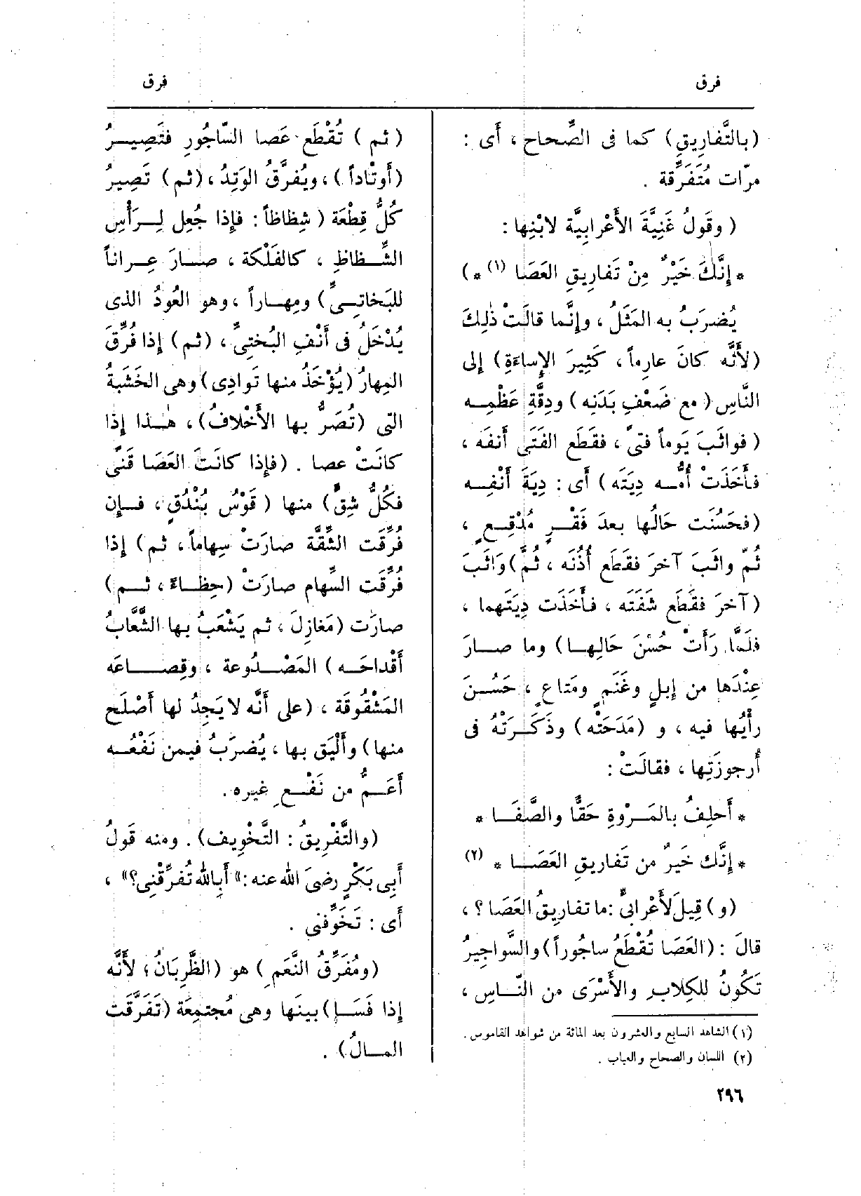 بالتّفاريقِ كَمَا فِي الصِّحاح، أَي: مرّات متفرِّقة. وقولُ غَنيّةَ الأعْرابيّة لابنِها: إنّك خيْرٌ منْ تَفارِيقِ العَصا يُضرَبُ بِهِ المثَلُ، وإنّما قالَت ذَلِك لأنّه كَانَ عارِماً، كثيرَ الإساءَةِ الى النّاس مَعَ ضَعْفِ بدَنِه ودِقّةِ عظْمِه فواثَبَ يَوْمًا فَتى، فقَطَع الفَتى أنفَه، فأخذَتْ أمُّه دِيَتَه أَي: دِيَة أنفِه فحَسُنَت حالُها بعدَ فقْرٍ مُدْقِعٍ، ثمّ واثَبَ آخرَ فقطَع أُذُنَه، ثمّ واثَبَ آخرَ فقطَع شفَتَه، فأخذَت ديَتَهما، فلمّا رأتْ حُسْنَ حالِها وَمَا صارَ عندَها من إبِلٍ وغَنم ومَتاع، حَسُن رأيُها فِيهِ، ومدَحَتْه وذكَرتْهُ فِي أُرجوزَتِها، فقالتْ: أحلِفُ بالمَرْوةِ حقّاً والصَّفا إنّك خيرٌ من تَفاريقِ العَصا وقيلَ لأعْرابيٍّ: مَا تَفاريقُ العَصا، قَالَ: العَصا تُقْطَعُ ساجوراً والسّواجيرُ تكون للكِلابِ والأسْرى من النَّاس، ثمَّ تُقْطَع عَصا السّاجورِ فتَصيرُ أوتاداً، ويُفرَّقُ الوَتِدُ، ثمَّ تَصيرُ كلُّ قِطْعَة شِظاظاً: فَإِذا جُعِل لرأسِ الشِّظاظِ، كالفَلْكة، صَار عِراناً للبَخاتيِّ ومِهاراً، وَهُوَ العودُ الَّذِي يُدْخَلُ فِي أنفِ البُخْتيِّ، ثمَّ إِذا فُرِّقَ المِهارُ يُؤخَذُ مِنْهَا تَوادِي وَهِي الخشَبَة الَّتِي تُصَرُّ بهَا الأخْلافُ، هَذَا إِذا كَانَت عَصا. فَإِذا كَانَت العَصا قنىً فكُلُّ شِقٍّ مِنْهَا قوْسٌ بُنْدُقٍ، فَإِن فُرِّقَت الشِّقّة صارَتْ سِهاماً، ثمَّ إِذا فُرِّقَت السِّهام صارَتْ حِظاءً، ثمَّ صارَت مَغازِلَ، ثمَّ يَشْعَبُ بهَا الشَّعّابُ أقْداحَه المَصْدوعة، وقِصاعَه المَشْقوقَة، على أنّه لَا يجِدُ لَهَا أصْلَح مِنْهَا وألْيَق بِهِ، يُضرَبُ فِيمَن نفْعُه أعمُّ من نفْعِ غَيره. والتّفْريقُ: التّخويف. وَمِنْه قولُ أبي بكْرٍ رضيَ الله عَنهُ: أبِالله تُفرِّقْني، أَي: تخوِّفني. ومُفَرِّقُ النِّعَم هُوَ الظَّرِبان لِأَنَّهُ إِذا فَسَا بينَها وَهِي مُجتمِعة تفرّقَت المالُ.