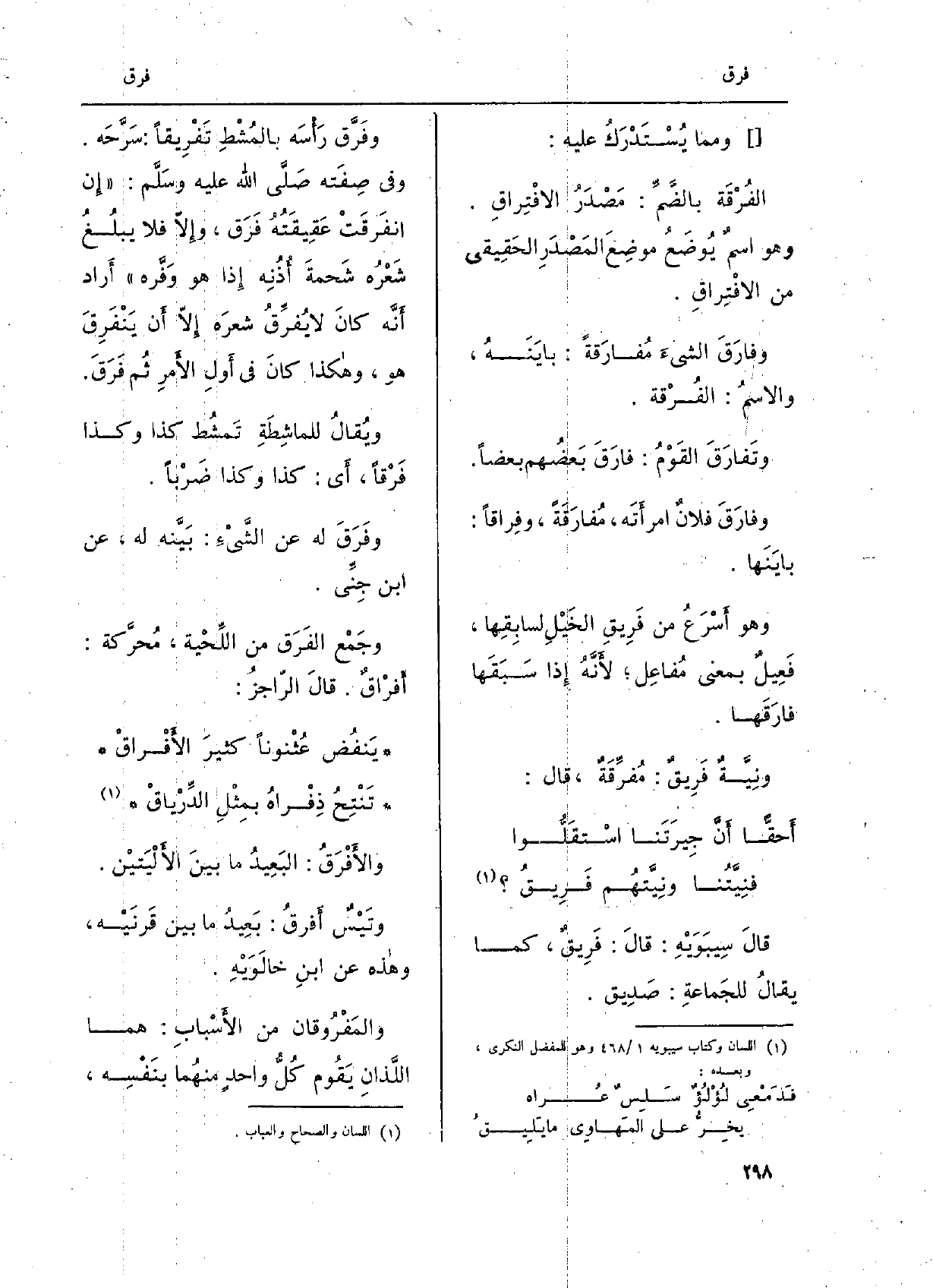 قَالَ سيبَوَيْه: قَالَ: فريقٌ، كَمَا يُقَال للْجَمَاعَة: صَديق. وفرّق رأسَه بالمُشْطِ تفْريقاً: سرّحَه. وَفِي صفَته صلّى الله عَلَيْهِ وسلّم: إِن انفَرقَتْ عَقيقَتُه فرَق، وَإِلَّا فَلَا يبلُغُ شعْرُه شَحمةَ أُذُنِه إِذا هُوَ وفّره أَرَادَ أنّه كَانَ لَا يُفرِّقُ شعرَه إِلَّا أَن ينفَرِقَ هُوَ، وَهَكَذَا كَانَ فِي أولِ الأمرِ ثمَّ فَرَق. ويُقال للماشِطَةِ تمشُط كَذَا وَكَذَا فَرْقاً، أَي: كَذَا وَكَذَا ضَرْباً. وفَرَقَ لَهُ عَن الشّيْء: بيّنه لَهُ، عَن ابنِ جِنّي. وجَمْع الفَرَق من اللّحْية، مُحرَّكة: أفْراقٌ. قَالَ الراجز: يَنفُض عُثْنوناً كثيرَ الأفْراقْ تَنْتِحُ ذِفْراهُ بمِثْلِ الدِّرْياقْ والأفْرَقُ: البَعيدُ مَا بينَ الألْيَتَيْن. وتَيْسٌ أفرقُ: بَعيدُ مَا بَين قَرنَيْه، وَهَذِه عَن ابنِ خالَوَيْه.
