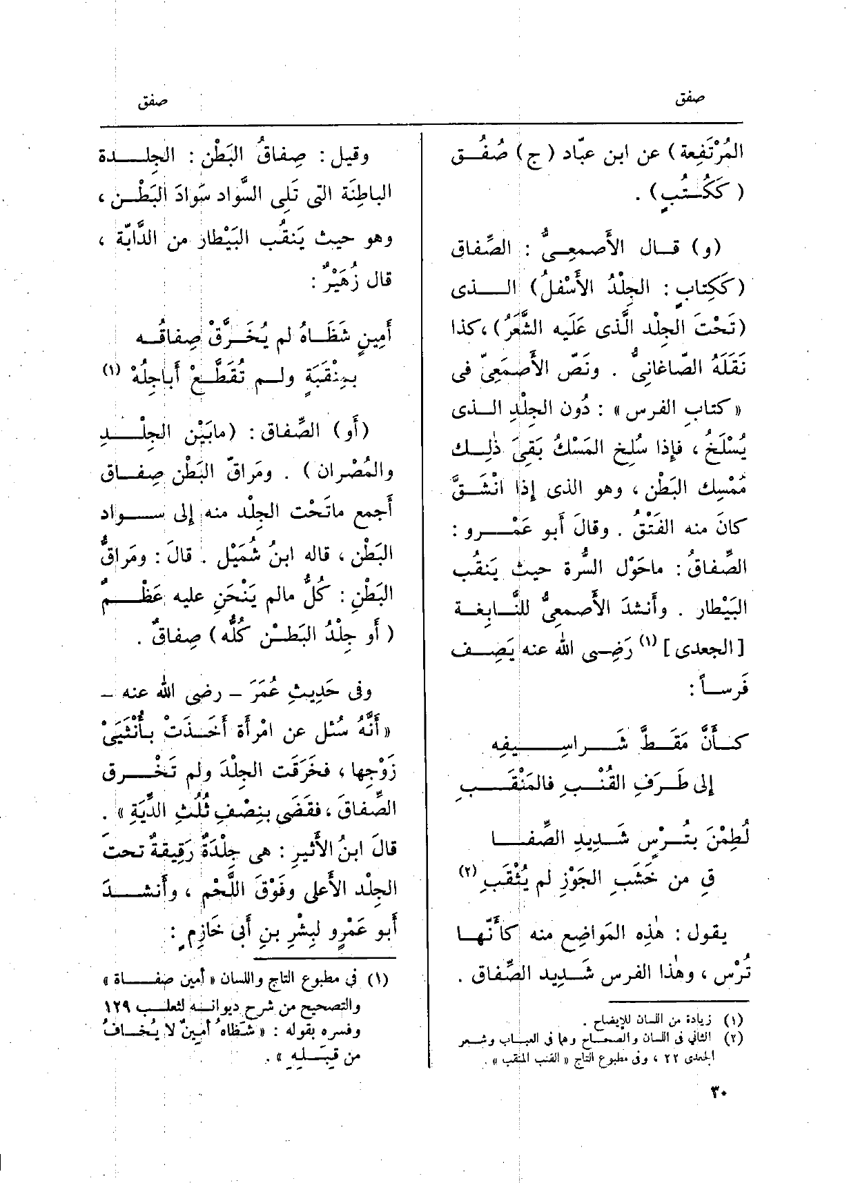 وَهَذَا الْفرس شَديد الصِّفاق. وَقيل: صِفاقُ البَطْن: الجِلدة الباطِنة الَّتِي تَلي السّواد سَوادَ البطْن، وَهُوَ حَيْثُ ينقُب البَيطار من الدّابّة، قَالَ زُهَيْرٌ: