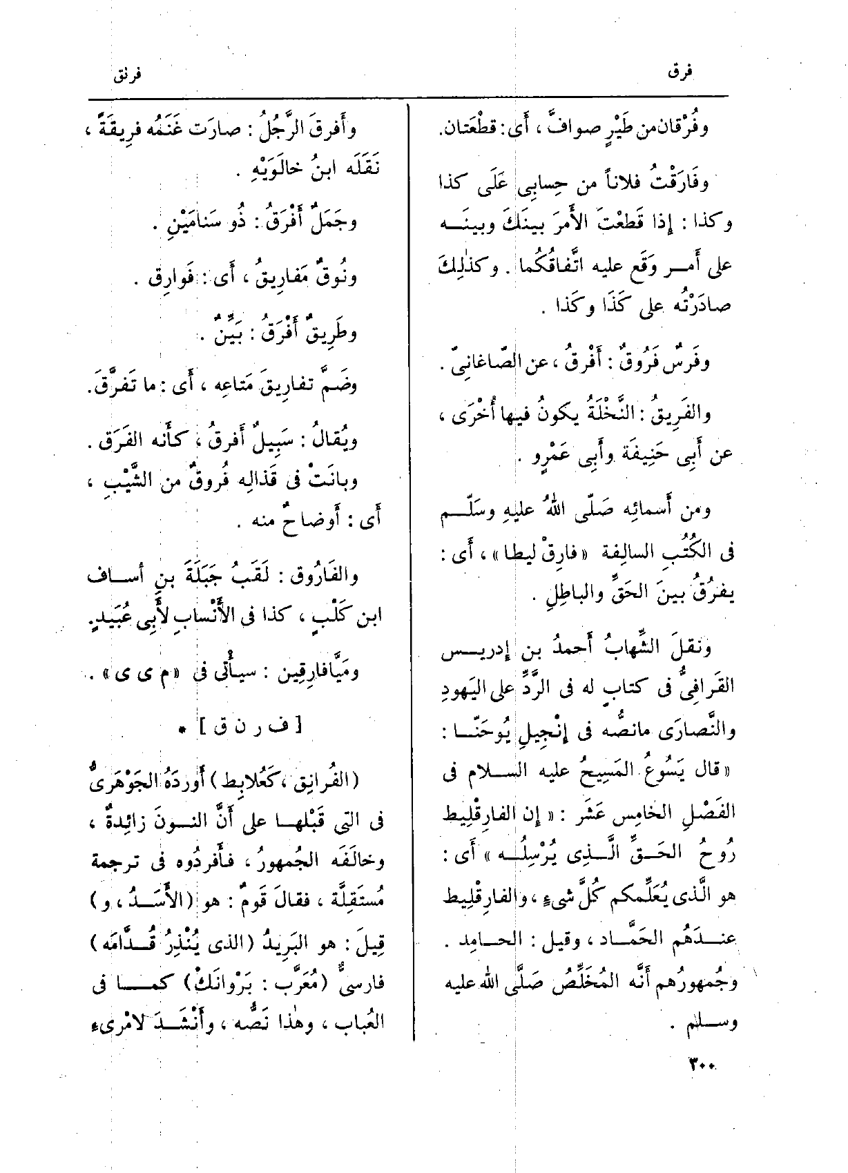 والفَريقُ: النخْلَةُ يكونُ فِيهَا أُخْرى، عَن أبي حَنيفَة وَأبي عَمْرو. وَمن أسمائِه صلّى الله عَلَيْهِ وَسلم فِي الكُتُبِ السالِفة فارِقْ ليطا، أَي يفرُقُ بينَ الحقِّ والباطِلِ. ونقلَ الشِّهابُ أحمدُ بن إِدْرِيس القَرافِيُّ فِي كتابٍ لَهُ فِي الرّدِّ على اليَهودِ والنَّصارَى مَا نصُّه فِي إنْجيلِ يوحَنّا: قَالَ يَسوعُ المسيحُ عَلَيْهِ السَّلَام فِي الفصْلِ الخامِس عشَر: إِن الفارِقْلِيط روحُ الحَقِّ الَّذِي يُرْسِلُه أَي: هُوَ الَّذِي يُعلِّمكم كُلَّ شيءٍ، والفارِقْلِيط عندَهُم الحَمّاد، وَقيل: الحامِد. وجُمهورُهم أنّه المُخَلِّصُ صلّى الله عَلَيْهِ وَسلم. وأفرقَ الرّجُلُ: صارَت غَنَمُه فريقَةً، نقلَه ابنُ خالَوَيْه. وجمَلٌ أفْرَقُ: ذُو سَنامَيْنِ. ونوقٌ مَفاريقُ، أَي: فَوارِق. وطَريقٌ أفْرَقُ: بَيِّنٌ. وضمّ تفاريقَ مَتاعِه، أَي: مَا تفرّقَ.