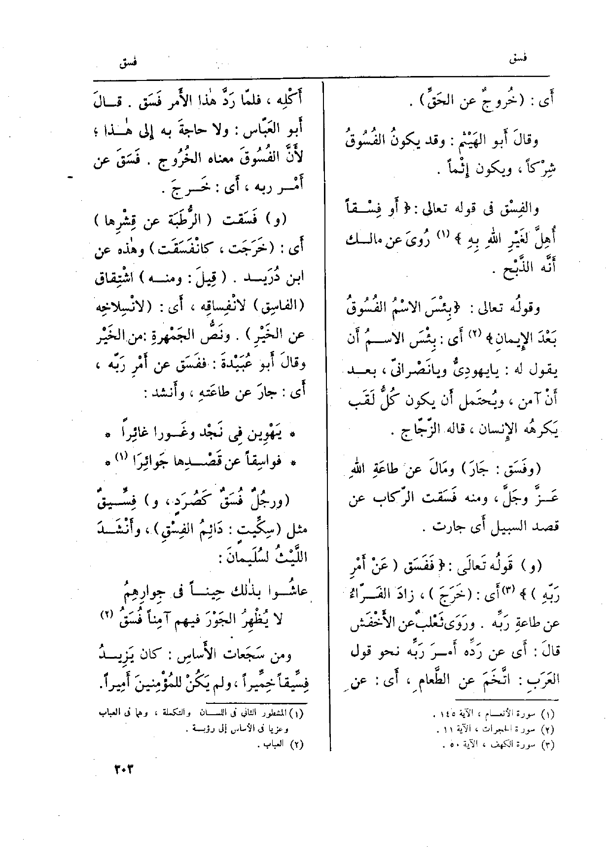 أَي: خُروجٌ عَن الحقِّ. وَقَالَ أَبُو الهيْثم: وَقد يكونُ الفُسوقُ شِرْكاً، وَيكون إثْماً. والفِسْق فِي قَوْله تَعَالَى:) أَو فِسْقاً أُهِلّ لغيرِ اللهِ بِهِ (رُويَ عَن مَالك أنّه الذّبْح. وقولُه تَعَالَى:) بِئْسَ الاسْمُ الفُسوقُ بعْدَ الْإِيمَان (أَي: بِئْسَ الاسمُ أَن يَقُول لَهُ: يَا يهودِيُّ وَيَا نَصْرانيّ، بعد أنْ آمن، ويُحتَمل أَن يكون كُلُّ لَقَب يكرهُه الْإِنْسَان، قَالَه الزّجّاج. وفَسَق: جارَ ومالَ عَن طاعَةِ اللهِ عزّ وجلّ، وَمِنْه فَسَقت الرّكاب عَن قصد السّبيل أَي جارت. وقولُه تَعَالَى:) فَفَسَق عنْ أمْرِ ربِّه (أَي: خرَج، زادَ الفَرّاءُ عَن طاعةِ ربِّه. ورَوَى ثعْلَبٌ عَن الأخْفَش قَالَ: أَي عَن ردِّه أمرَ ربِّه نَحْو قَول العَرَب: اتّخَم عَن الطّعام، أَي: عنِ أكْلِه، فلمّا ردَّ هَذَا الْأُم رفسَق. قَالَ أَبُو العبّاس: وَلَا حاجةَ بِهِ الى هَذَا لأنّ الفُسوقَ مَعْنَاهُ الخُروج. فسَقَ عَن أمْر ربّه، أَي: خرَج. وفسَقت الرُّطَبَة عَن قِشْرِها أَي: خرجَت، كانْفَسَقَت وَهَذِه عَن ابنِ دُرَيْد. قيل: وَمِنْه اشتِقاق الفاسِق لانْفِساقِه، أَي: لانسِلاخِه عَن الخَيْر. ونصُّ الجَمْهَرة: من الخَيْر وَقَالَ أَبُو عُبَيدة: ففَسَق عَن أمرِ ربّه، أَي: جارَ عَن طاعَتِه، وَأنْشد: يهْوِين فِي نجْد وغَوْراً غائِرا فَواسِقاً عَن قصْدِها جَوائِرا ورجُلٌ فُسَقٌ كصُرَد، وفِسّيقٌ مثل سِكِّيت: دائِمُ الفِسْق، وأنشدَ اللّيثُ لسُلَيمان:
