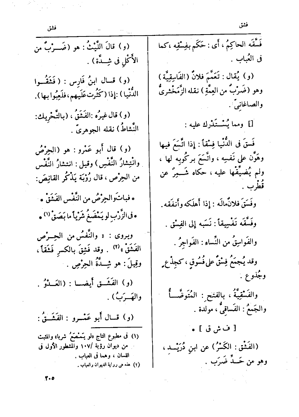والفَواسِقُ من النِّساءِ: الفواجِرُ. وَقد يُجمَعُ فِسْقٌ على فُسوقٍ، كجِذْعٍ وجُذوع. والفَسْقِيّةُ، بِالْفَتْح: المتَوضَّأُ والجَمْعُ: الفَساقِيُّ، مولدة.