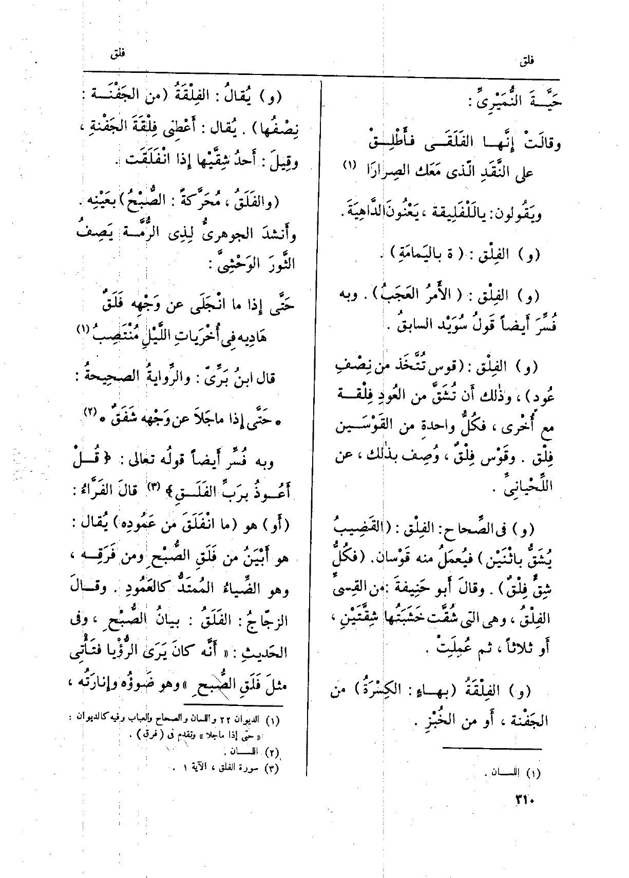 وَيَقُولُونَ: يَا لَلْفَليقة، يعْنون الدّاهِيةَ. والفِلْق: ة باليَمامَة. والفِلْق: الأمرُ العَجَبُ. وَبِه فُسِّر أَيْضا قولُ سُوَيْد السابقُ. والفِلْق: قَوس تُتّخَذ من نِصْفِ عود، وَذَلِكَ أَن تُشَقَّ من العودِ فِلْقة مَعَ أخْرى، فكُلّ وَاحِدَة من القَوْسين فِلْق. وقوْس فِلْقٌ، وُصِف بذلك، عَن اللّحْياني. وَفِي الصِّحاح: الفِلْق: القَضيبُ يُشَقُّ باثْنَيْن فيُعْملُ مِنْهُ قوْسان. فكُلُّ شِقٍّ فِلْقٌ. وَقَالَ أَبُو حَنيفَة: من القِسيِّ الفِلْقُ، وَهِي الَّتِي شُقَّت خَشَبَتُها شِقّتَيْن، أَو ثَلَاثًا، ثمَّ عُمِلَتْ. والفِلْقَةُ بهاءٍ: الكِسْرةُ من الجَفْنة، أَو من الخُبْزِ. ويُقال: الفِلْقَةُ من الجَفْنَة: نِصْفُها. يُقال: أعْطِني فِلقَةَ الجَفْنةِ، وَقيل: أحدُ شِقَّيْها إِذا انْفَلَقَت.