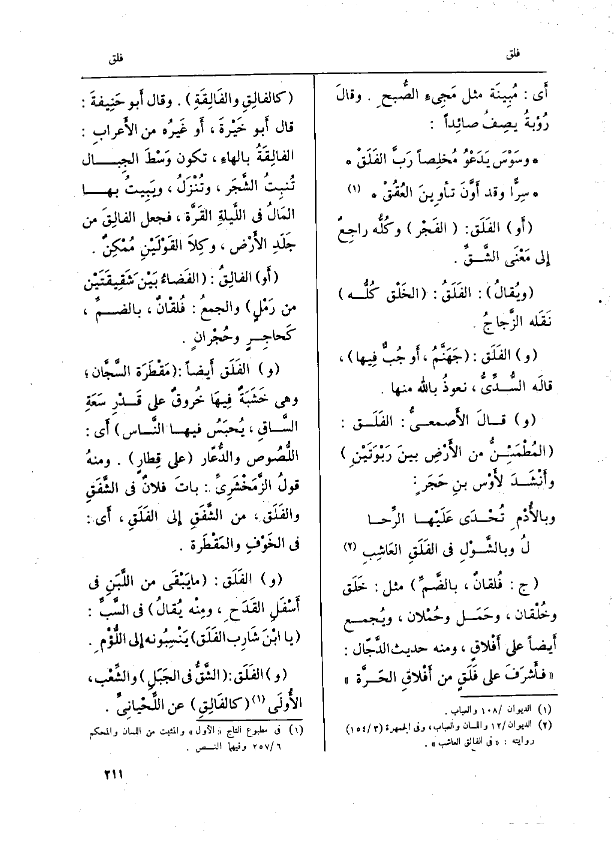 أَي: مُبينَة مثل مَجيءِ الصُبْح. وَقَالَ رؤبة يصِفُ صائِداً: وَسْوَسَ يَدْعو مُخلِصاً ربَّ الفَلَقْ سِرّاً وَقد أوّنَ تأوينَ العُقُقْ أَو الفَلَق: الفَجْر وكُلُّه راجِعٌ الى معْنَى الشَّقِّ. ويُقال: الفَلَقُ: الخَلْق كُلُّه نقَله الزّجاجُ. والفَلَق: جهنّمُ، أَو جُبٌّ فِيهَا، قالَه السُّدِّيُّ، نعوذُ بِاللَّه مِنْهَا. وَقَالَ الأصمعيُّ: الفَلَق: المُطْمَئِنُّ من الأَرْض بينَ رَبْوَتَيْن وأنشَدَ لأوْس بنِ حَجَر: