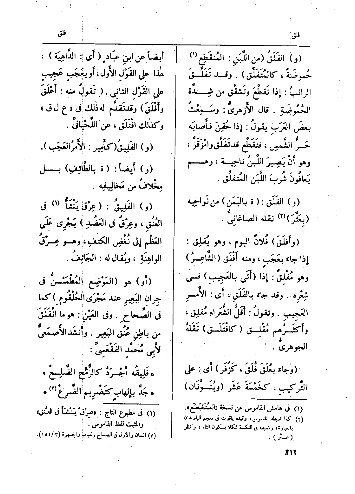 والفَلَقُ من اللّبن: المُنقَطِع حُموضَةً، كالمُتَفَلِّق. وَقد تفلّقَ الرائبُ: إِذا تقطّعَ وتشقّق من شِدّة الحُموضَة. قَالَ الأزهريُّ: وسَمعْتُ بعضَ العَرَبِ يَقُول: إِذا حُقِنَ فأصابَه حَرُّ الشّمسِ، فتقطّع قد تفلَّق وامْزَقَرّ، وَهُوَ أَن يَصيرَ اللّبنُ ناحِية، وهم يَعافونَ شُربَ اللّبَن المُتفلِّق. والفَلَق: ة باليمَن من نَواحِيه بِعَثَّرَ نَقله الصاغانيُّ. وأفلَقَ فُلانٌ الْيَوْم، وَهُوَ يُفلِق: إِذا جاءَ بعجَبٍ، وَمِنْه أفْلَق الشّاعِرُ وَهُوَ مُفْلِقٌ: إِذا أَتَى بالعَجيبِ فِي شِعْرِه. وَقد جاءَ بالفَلَقِ، أَي: الأمرِ العَجيب. وَتقول: أقَلُّ الشُعَراءِ مُفلِق، وأكثَرُهم مُقْلِق كافْتَلَق نقَلهُ الجوهريُّ. وجاءَ بعُلَقَ فُلَقَ، كزُفَر أَي: التّركيبِ، كخَمْسَةَ عَشَر ويُنوَّنان أَيْضا عَن ابنِ عبّادٍ أَي: الدّاهيَة، هَذَا على القوْلِ الأول، أَو بعجَبٍ عَجيبٍ على القوْل الثَّانِي. تَقول مِنْهُ: أعْلَقَ وأفْلَق وَقد تقدّم لَهُ ذَلِك فِي ع ل ق وَكَذَلِكَ افْتَلَق، عَن اللِّحْياني. والفَلِيقُ كأمِير: الأمرُ العَجَب. وَأَيْضًا: ة بالطّائِفِ بل مِخْلافٌ من مَخالِيفِه.
