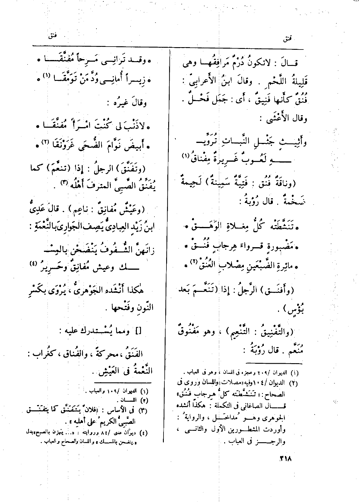 هَكَذَا أنْشدَه الجوْهريُّ، يُرْوى بكسْر النُّون وفتْحها. وَمِمَّا يُستدرك عَلَيْهِ: الفَنَقُ: محركةً، والفُناق، كغُراب: النَّعْمةُ فِي الْعَيْش.