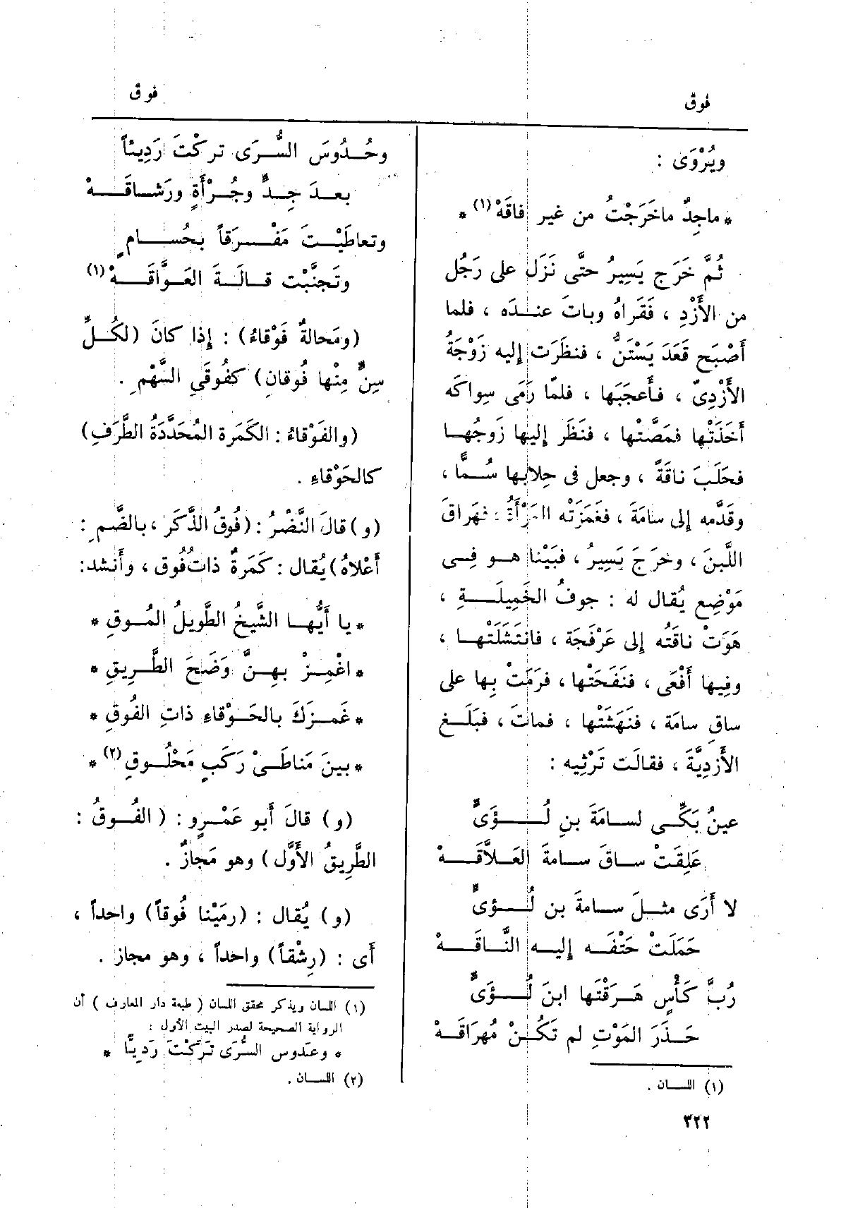ومَحالةٌ {فَوْقاءُ: إِذا كَانَ لكُلّ سِنٍّ منْها} فُوقانِ كفوقَي السّهْم. {والفَوْقاءُ: الكَمَرة المُحَدَّدةُ الطّرَف كالحَوْقاءِ. وَقَالَ النّضْرُ:} فُوقُ الذّكَر، بالضّم: أعْلاه يُقال: كمَرةٌ ذاتُ فُوق، وَأنْشد: يَا أيُّها الشيخُ الطّويلُ المُوقِ اغْمِزْ بهِنّ وضَحَ الطّريقِ غَمزَكَ بالحَوْقاءِ ذاتِ {الفوقِ بينَ مَناطَيْ ركَبٍ مَحْلوقِ)