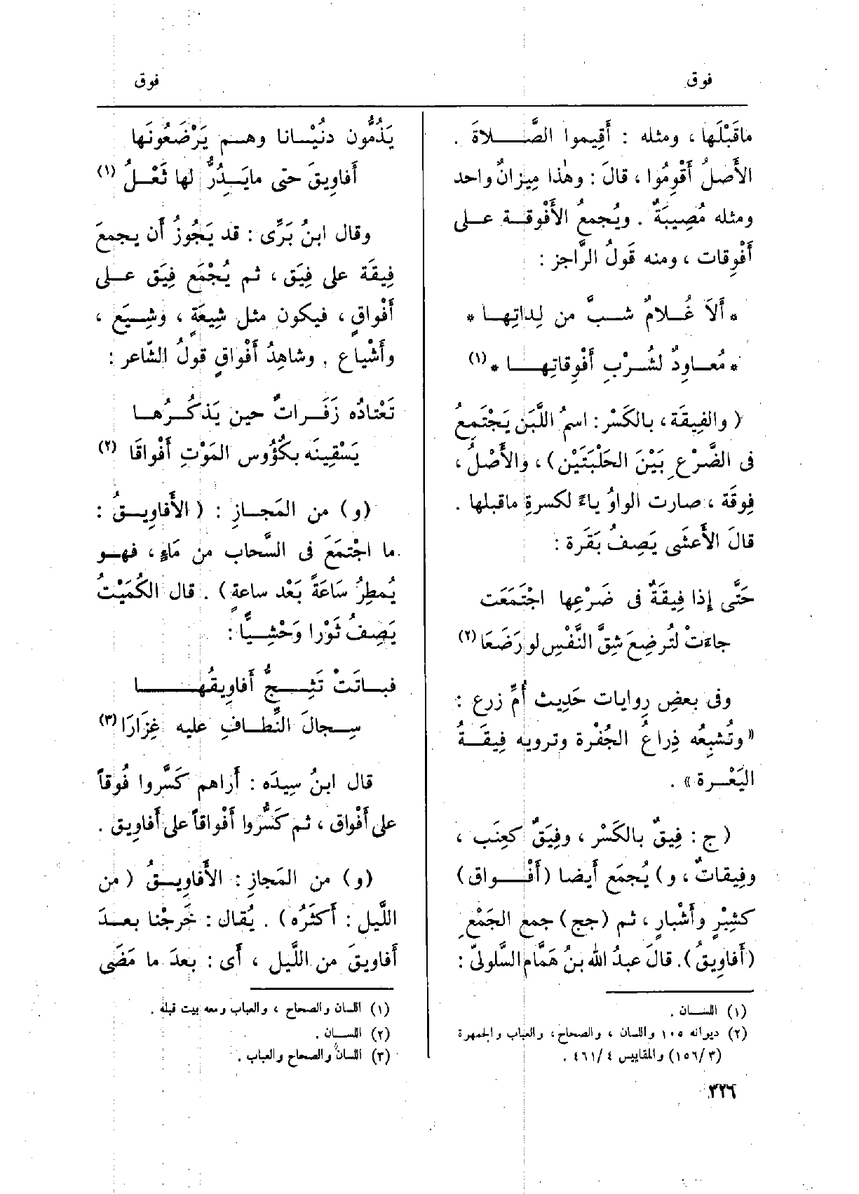 مَا قَبلَها، وَمثله: أقِيموا الصّلاةَ. الأصلُ أقْوِموا، قَالَ: وَهَذَا ميزانٌ وَاحِد وَمثله مُصيبَةٌ. ويُجمعُ {الأفْوقة على} أفْوِقات، وَمِنْه قَولُ الرّاجز: أَلا غُلامٌ شبّ من لِداتِها مُعاوِدٌ لشُرْبِ {أفْوِقاتِها} والفِيقَة، بالكَسْر: اسمُ اللّبَن يجْتَمعُ فِي الضّرْع بيْن الحَلْبَتَيْن، والأصْلُ، {فِوقَة، صَارَت الواوُ يَاء لكسرةِ مَا قبلهَا. قَالَ الْأَعْشَى يصِفُ بَقَرة: