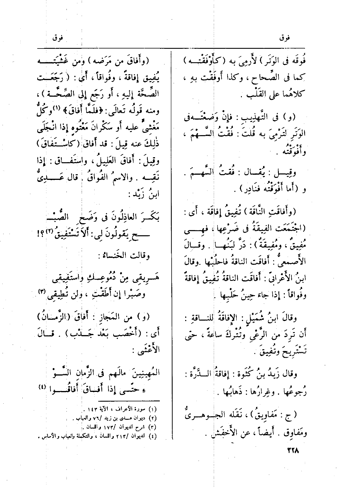 {فُوقَه فِي الوَتَر لأرمِيَ بِهِ} كأوْفَقْته كَمَا فِي الصِّحاح، وَكَذَا {أوفَقْت بِهِ، كلاهُما على القَلب. وَفِي التّهذيب: فإنْ وضعْتَه فِي الوَتَر لتَرْميَ بِهِ قُلت:} فُقْتُ السّهْمَ، {وأفْوَقْتُه. وَقيل: يُقال:} فُقتُ السّهمَ. وَأما {أفْوَقْتُه فنادِر.} وأفاقَتِ النّاقَة {تُفيقُ} إفاقَة، أَي: اجتَمَعَت {الفِيقَةُ فِي ضَرْعِها، فهِي} مُفيقٌ، {ومُفيقَةٌ: دَرَّ لبَنُها. وَقَالَ الأصمعيّ:} أفاقَت الناقةُ فاحلُبْها. وَقَالَ ابنُ الأعرابيّ: {أفاقَت الناقةُ} تُفيقُ {إفاقةً} وفُواقاً: إِذا جاءَ حينُ حلْبِها. وَقَالَ ابنُ شُمَيْل: {الإفاقَةُ للناقةِ: أَن ترِدَ من الرّعْيِ وتُتْركَ سَاعَة، حَتَّى تسْتَريحَ} وتُفيقَ. وَقَالَ زيدُ بنُ كُثَوة: {إفاقةُ الدّرَّة: رجوعُها. وغِرارُها: ذهابُها. ج:} مَفاويقُ، نقَله الجوهريُّ {ومَفاوِق. أَيْضا، عَن الْأَخْفَش.} وأفاقَ من مرَضه وَمن غشْيَته يُفيق {إفاقَةً،} وفُواقاً، أَي: رجَعَت الصّحّة إليهِ، أَو رجَع الى الصّحّة، وَمِنْه قولُه تَعالَى:) فلمّا {أفاقَ (وكُلُّ مَغْشِيٍّ عَلَيْهِ أَو سَكْرانَ معْتوهٍ إِذا انْجَلَى ذلِك عَنهُ قِيلَ: قد} أَفَاق {كاسْتَفاقَ وَقيل:} أفاقَ العَليلُ، {واستَفاق: إِذا نَقِه. والاسمُ} الفُواقُ. قَالَ عَديُّ بنُ زَيْد:
