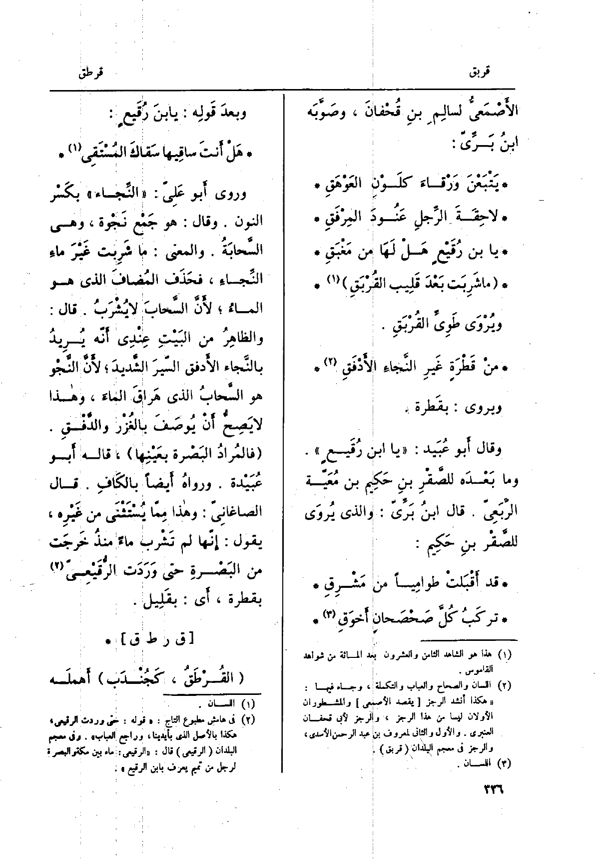 منع قَطْرَةٍ غيرِ النّجاءِ الأدْفَقِ ويروى: بقَطرة. وَقَالَ أَبُو عبيد: يَا ابنَ رُقَيعٍ. وَمَا بعْدَه للصّقْرِ بنِ حَكيم بن مُعَيّة الرّبَعِيّ. قَالَ ابنُ بَرّي: وَالَّذِي يُروى للصّقْرِ بنِ حَكيم: قد أقْبَلتْ طوامِياً من مَشرِقِ تركَبُ كُلَّ صَحْصَحانٍ أخوَقِ وَبعد قولِه: يَا بنَ رُقَيعٍ: هلْ أنتَ ساقِيها سَقاكَ المُستَقي وروى أَبُو عليّ: النِّجاء بكسْر النُّون. وَقَالَ: هُوَ جمْع نَجْوة، وَهِي السّحابَةُ. وَالْمعْنَى: مَا شرِبت غيْرَ ماءِ النِّجاءِ، فحذَف المُضافَ الَّذِي هُوَ الماءُ لأنّ السّحابَ لَا يُشرَبُ. قَالَ: والظاهِرُ من البَيْتِ عِندي أنّه يُريدُ بالنَّجاءِ الأدفق السّيرَ الشّديدَ لأنّ النّجْو هُوَ السّحابُ الَّذِي هَراقَ الماءَ، وَهَذَا لَا يصِحُّ أَن يوصَفَ بالغُزْر والدَّفْقِ. فالمُرادُ البَصْرة بعَيْنِها، قَالَه أَبُو عُبيْدة. ورواهُ أَيْضا بِالْكَاف. قَالَ الصَّاغَانِي: وَهَذَا مِمَّا يُستَثْنى من غيرِه، يَقُول: إنّها لم تشْرب مَاء منذُ خرجَت من البَصْرةِ حَتَّى وردَت الرُّقَيْعيّ بقطرة، أَي: بقَليل.)