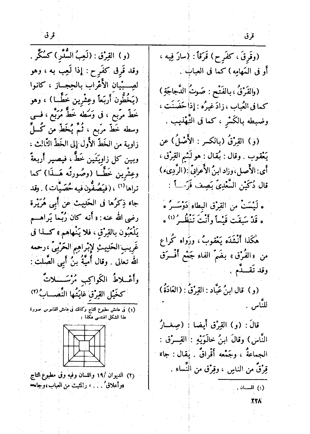 ليسَتْ من القِرْقِ البِطاءِ دوْسَرُ قد سبَقَت قيْساً وأنتَ تنْظُرُ هَكَذَا أنشدَه يعْقوبُ، ورَواه كُراع من الفُرْق بضمّ الفاءِ جمْع أفْرَق وَقد تقدّم. وَقَالَ ابنُ عبّاد: القِرْقُ: العادَةُ للنّاس. قَالَ: والقِرْق أَيْضا: صِغار النّاس وَقَالَ ابنُ خالَوَيْه: القِرْق: الجماعةُ، وجمْعه أقْراقٌ. يُقَال: جاءَ قِرْقٌ من النَّاس، وقِرْق من النِّساءِ. والقِرْق: لعِبُ السُّدَّرِ كسُكَّر. وَقد قَرِق كفرِح: إِذا لعِبَ بِهِ، وَهُوَ لصِبْيانِ الأعْراب بالحِجاز، كَانُوا يخُطّون أربَعاً وعِشْرين خطّاً، وَهُوَ خطّ مربّع، فِي وسَطِه خطٌّ مربَّع، فِي وَسطه خطّ مربّع، ثمّ يُخَطّ من كُلِّ زَاوِيَة من الخَطّ الأول الى الخطّ الثَّالِث، وَبَين كل زاويَتَين خطٌّ، فَيصير أَرْبَعَة وعِشرين خطّاً وصورتُه هَذَا كَمَا ترَاهَا، فيصُفّون فِيهِ حُصَيّآت. وَقد جاءَ ذكرُها فِي الحَدِيث عَن أبي هُريرة رَضِي الله عَنهُ: أَنه كَانَ ربّما يَراهم يلعَبون بالقِرْقِ، فَلَا ينْهاهُم، كَذَا فِي غَريبِ الحَدِيث لإِبْرَاهِيم الحرْبي، رَحمَه الله تَعَالَى. وَقَالَ أميّة بنُ أبي الصّلت: