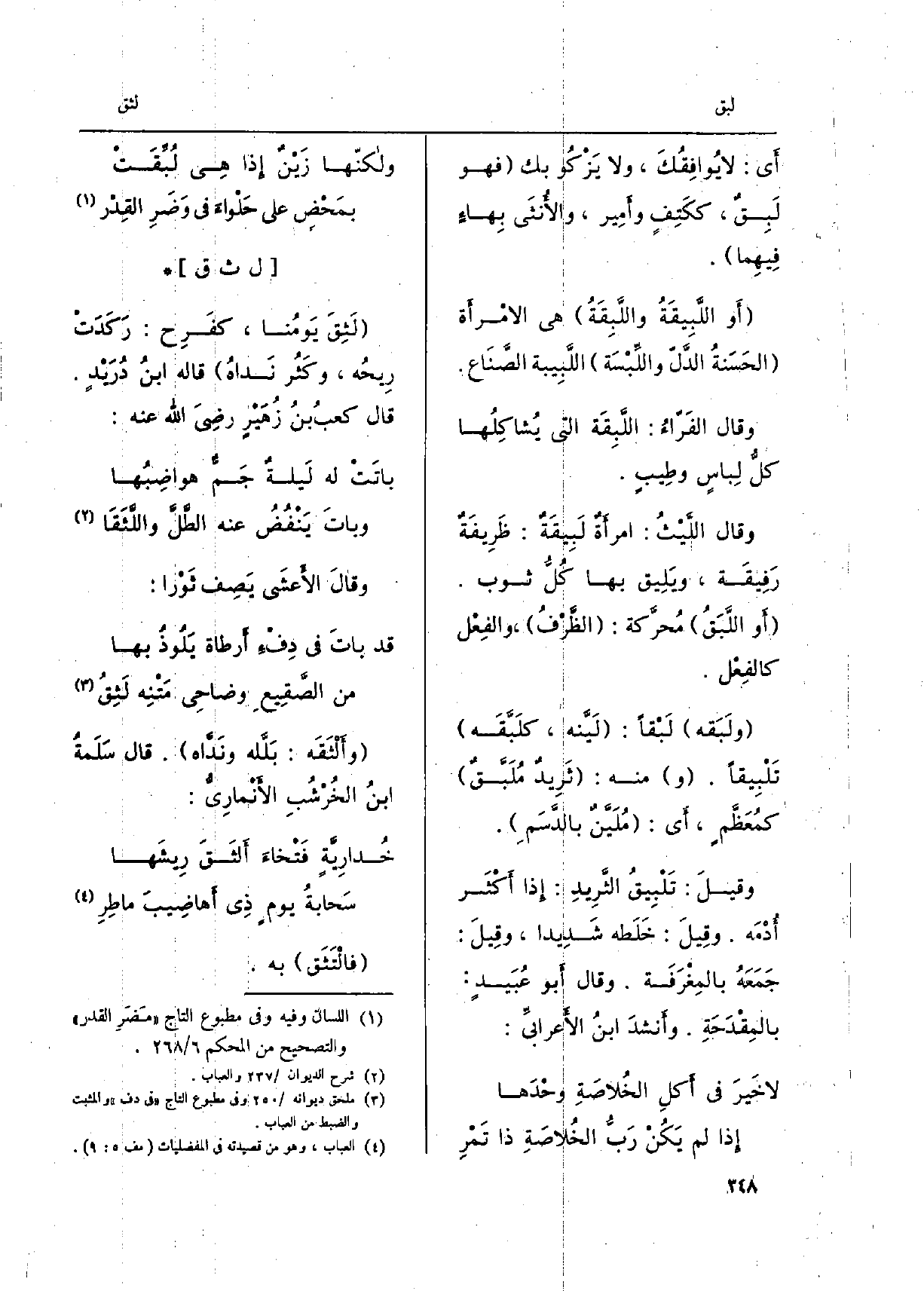 أَي: لَا يوافِقُك، وَلَا يزْكو بك فَهُوَ لَبِقٌ، ككَتِفٍ وأمير، وَالْأُنْثَى بهاءٍ فيهِما. أَو اللّبيقَةُ واللَّبِقَةُ هِيَ الامْرأة الحسَنةُ الدّلّ واللِّبْسَة اللّبِيبة الصَّناع. وَقَالَ الفرّاءُ: اللَّبِقَة الَّتِي يُشاكِلُها كلُّ لِباسٍ وطِيبٍ. وَقَالَ اللّيثُ: امرأةٌ لَبيقَةٌ: ظَريفَةٌ رَفيقَة، ويَليق بهَا كُلُّ ثوب. أَو اللَّبَقُ مُحرّكة: الظّرْفُ، والفِعْل كالفِعْل. ولَبَقه لَبْقاً: ليّنه، كلبَّقه تلْبيقاً. وَمِنْه: ثَريدٌ مُلَبَّقٌ كمُعَظَّم، أَي: مُلَيَّنٌ بالدّسَم. وَقيل: تلْبيقُ الثّريد: إِذا أكْثَر أُدْمَه. وَقيل: خلَطه شَديداً، وَقيل: جمَعَهُ بالمِغْرَفَة. وَقَالَ أَبُو عُبيد: بالمِقْدَحَة. وَأنْشد ابنُ الْأَعرَابِي: