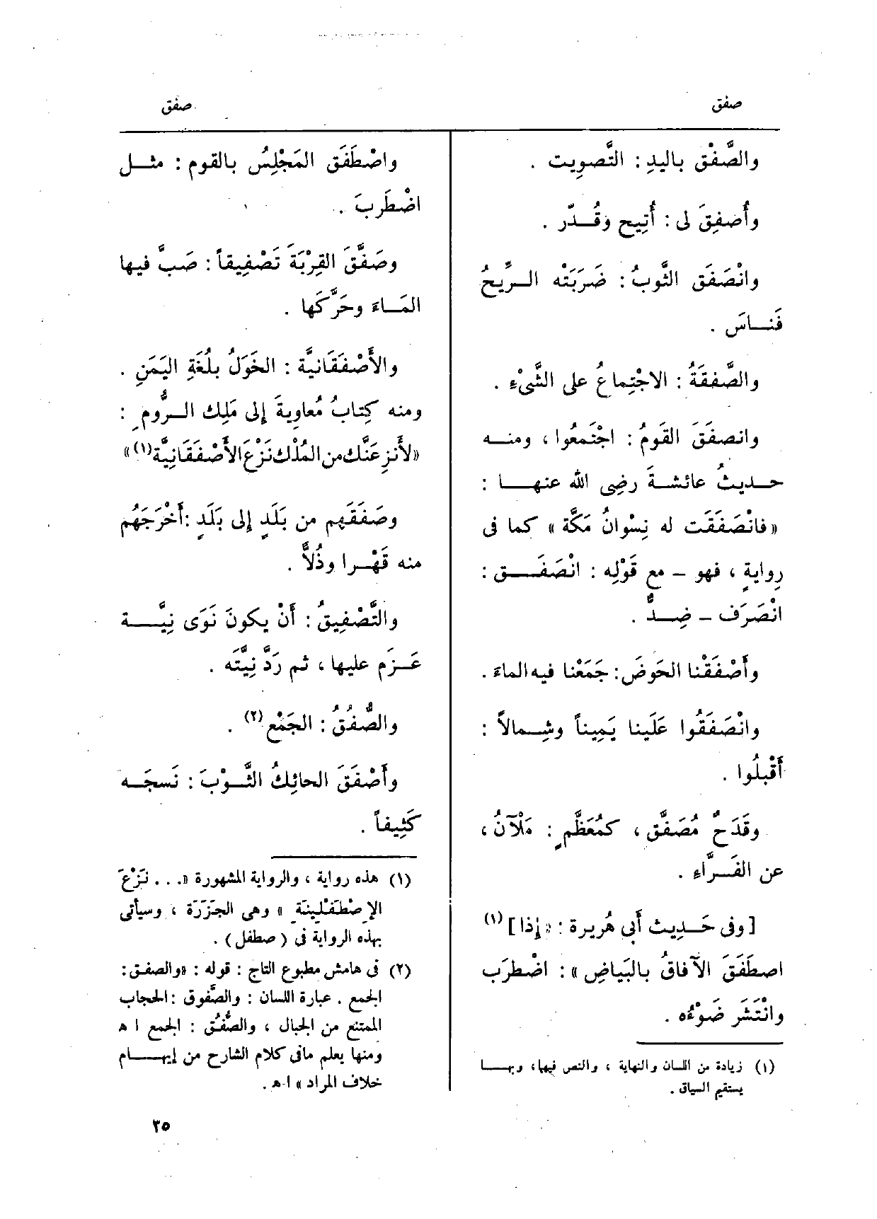 والأصْفقانيّة: الخَوَلُ بلُغةِ اليَمَن. وَمِنْه كِتابُ مُعاويةَ الى ملِك الرّوم: لأنزِعَنّك من المُلْكِ نَزْعَ الأصْفَقانيّة. وصَفَقَهم من بَلَدٍ الى بلَد: أخرَجَهُم مِنْهُ قَهْراً وذُلاً. والتّصْفيق: أَن يكون نَوَى نِيّة عزَم عَلَيْهَا، ثمَّ ردّ نيّتَه. والصُّفُق: الجمْع. وأصْفَق الحائِكُ الثّوْبَ: نسجَه كَثيفاً.