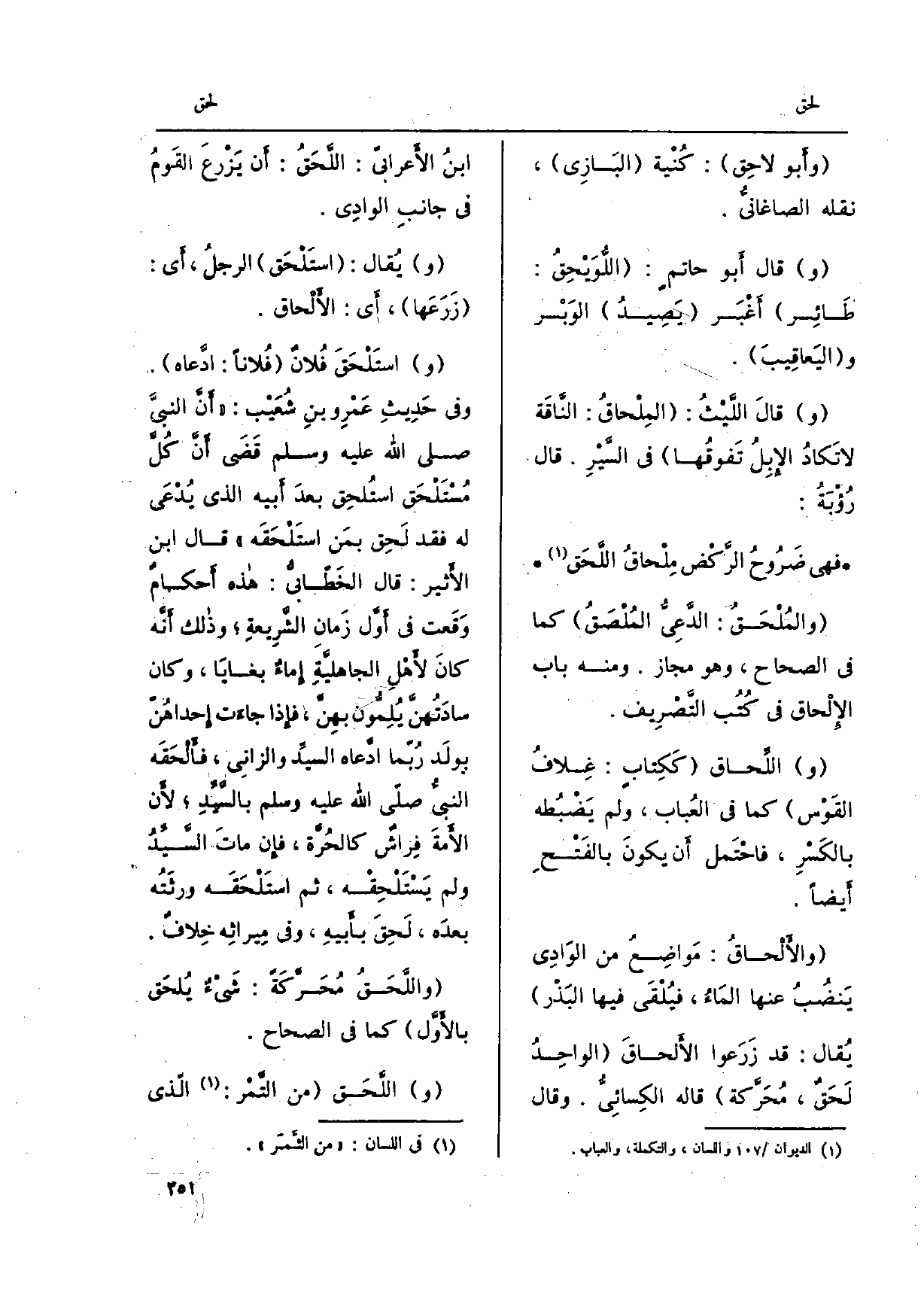 وَأَبُو لاحِق: كُنْية الْبَازِي، نَقله الصاغانيّ. وَقَالَ أَبُو حَاتِم: اللُّوَيْحِقُ: طائِر أغْبَر يَصيدُ الوَبْر واليَعاقِيبَ. وَقَالَ اللّيثُ: المِلْحاقُ: النّاقَة لَا تكادُ الإبِلُ تَفوقُها فِي السّيْر. قَالَ رؤبَة: فَهِيَ ضَروحُ الرّكْضِ مِلْحاقُ اللَّحَق والمُلْحَقُ: الدَّعِيُّ المُلصَقُ كَمَا فِي الصّحاح، وَهُوَ مجَاز. وَمِنْه بَاب الإلْحاق فِي كُتُب التّصْريف. واللِّحاق ككِتاب: غِلافُ القَوْس كَمَا فِي العُباب، وَلم يضْبطُه بالكسْر، فاحْتَمل أَن يكونَ بالفَتْح أَيْضا. والألْحاقُ: مَواضِعُ من الوادِي ينضُبُ عَنْهَا الماءُ، فيُلْقَى فِيهَا البَذْر يُقال: قد زَرَعوا الألحاقَ الواحِدُ لَحَقٌ، مُحرّكة قَالَه الكِسائيُّ. وَقَالَ ابنُ الأعرابيّ: اللَّحَقُ: أَن يزْرعَ القومُ فِي جانبِ الْوَادي. ويُقال: استَلْحَق الرجلُ، أَي: زَرَعها، أَي: الألْحاق. واستَلْحَقَ فُلانٌ فُلاناً: ادّعاه. وَفِي حَدِيث عَمْرو بنِ شُعَيْب: أنّ النبيّ صلّى الله عَلَيْهِ وَسلم قَضَى أنّ كُلَّ مُسْتَلْحَق استُلحِق بعدَ أَبِيه الَّذِي يُدْعى لَهُ فقد لحِق بمَنْ استَلْحَقَه، قَالَ ابنُ الْأَثِير: قَالَ الخَطّابيّ: هَذِه أحكامٌ وقَعت فِي أوّل زَمانِ الشّريعةِ وَذَلِكَ أنّه كَانَ لأهْلِ الجاهليّةِ إماءٌ بَغَايَا، وَكَانَ سادَتُهنّ يُلِمّون بهِنّ، فَإِذا جاءَت إحداهُنّ بولَد رُبّما ادّعاه السّيّد وَالزَّانِي، فألْحَقَه النبيُّ صلّى الله عَلَيْهِ وَسلم بالسَّيِّد لأنّ الأمةَ فِراشٌ كالحُرّة، فَإِن مَاتَ السّيِّدُ وَلم يسْتَلْحِقْه، ثمَّ استَلْحَقَه ورثَتُه بعده، لحِقَ بِأَبِيهِ، وَفِي مِيراثِه خِلافٌ. واللَّحَقُ مُحرّكةً: شيءٌ يُلحَق بالأوّل كَمَا فِي الصِّحَاح. واللَّحَق من التّمْر: الَّذِي
