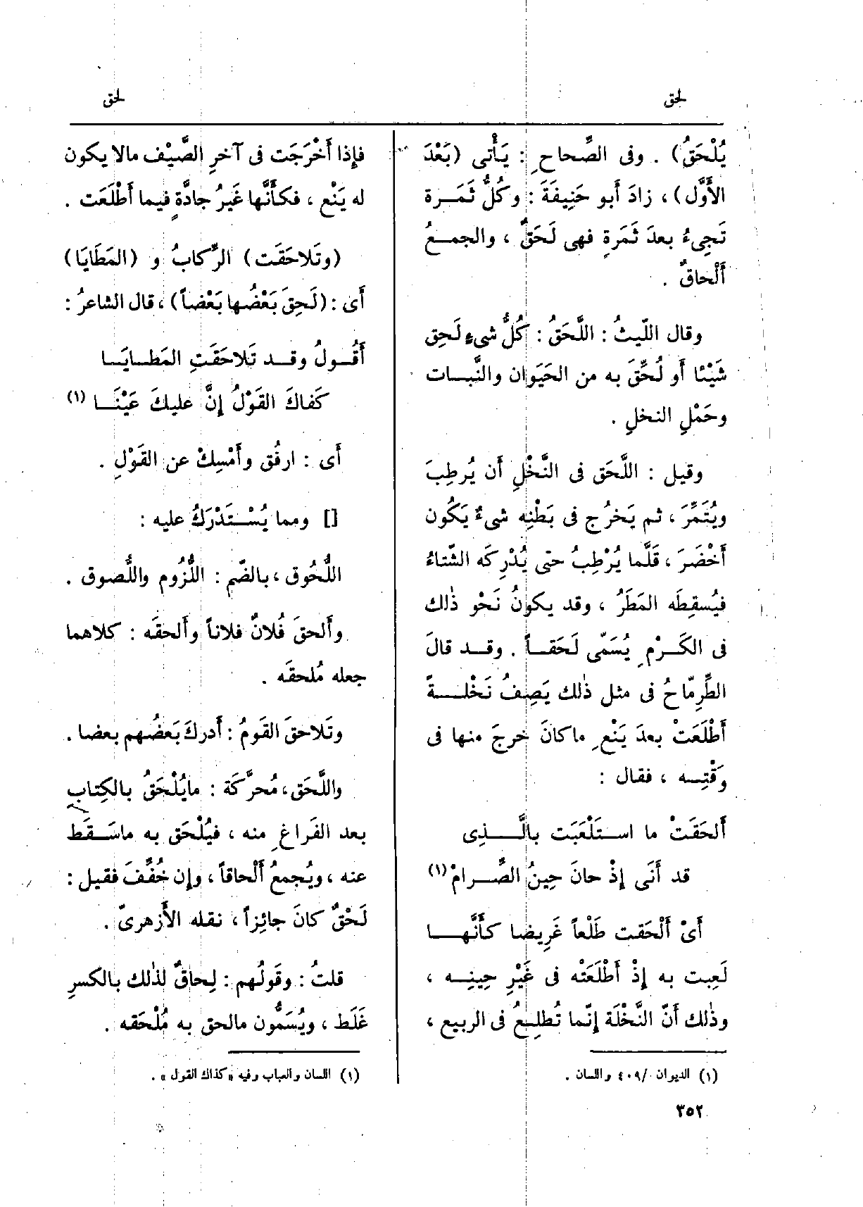 أَي: ارفُق وأمْسِكْ عَن القوْلِ. وَمِمَّا يُسْتَدْرَكُ عَلَيْهِ: اللُّحُوق، بالضّمِّ: اللّزوم واللّصوق. وألحقَ فُلانٌ فلَانا وألحقَه: كِلَاهُمَا جعله مُلحقَه. وتَلاحقَ القومُ: أدركَ بعضُهم بَعْضًا. واللَّحَق، مُحرّكة: مَا يُلْحَقُ بالكِتاب بعد الفَراغِ مِنْهُ، فيُلْحَق بِهِ مَا سَقَط عَنهُ، ويُجمعُ ألْحاقاً، وَإِن خُفِّفَ فَقيل: لَحْقٌ كَانَ جائِزاً، نَقله الأزهريّ. قلت: وقولُهم: لِحاقٌ لذَلِك بالكسرِ غلَط، ويُسَمُّون مَا لحق بِهِ مُلْحَقه.