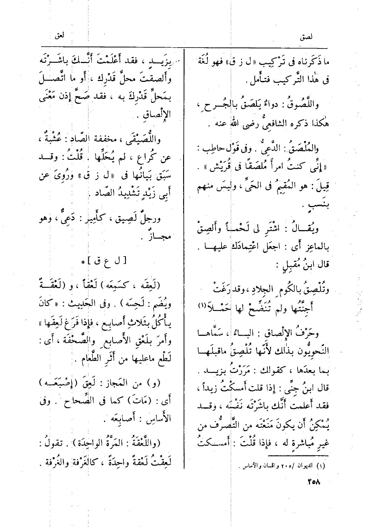 مَا ذكَرناه فِي تركيب ل ز ق فَهُوَ لُغَة فِي هَذَا التَّرْكِيب فَتَأمل. واللَّصُوق: دواءٌ يَلصَقُ بالجُرحِ، هَكَذَا ذكره الشافِعيّ رَضِي الله عَنهُ. والمُلْصَقُ: الدَّعِيُّ. وَفِي قوْل حاطِب: إنّي كنتُ امْرأ مُلصَقاً فِي قُرَيْش. قيل: هُوَ المُقيمُ فِي الحَيِّ، وليسَ مِنْهُم بنَسبٍ. ويُقال: اشْتَرِ لي لَحْماً وأَلصِقْ بالماعِز)