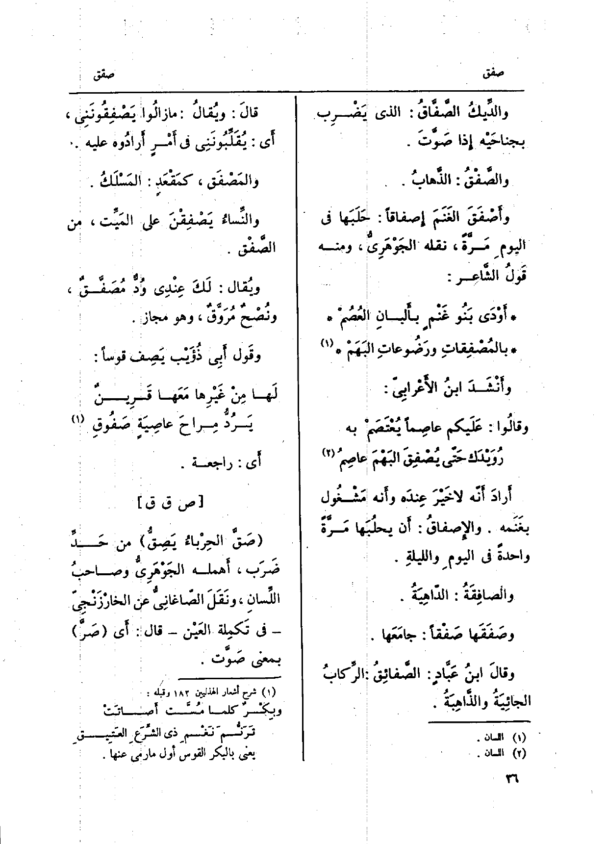 والديكُ الصَّفّاقُ: الَّذِي يضْرِب بجناحَيْه إِذا صوّتَ. والصّفْقُ: الذّهابُ. وأصْفَقَ الغَنَم إصفاقاً: حلَبَها فِي الْيَوْم مرّةً، نَقله الجوْهَريّ، وَمِنْه قَول الشّاعر: أوْدى بَنو غَنْمٍ بألْبانِ العُصُمْ)