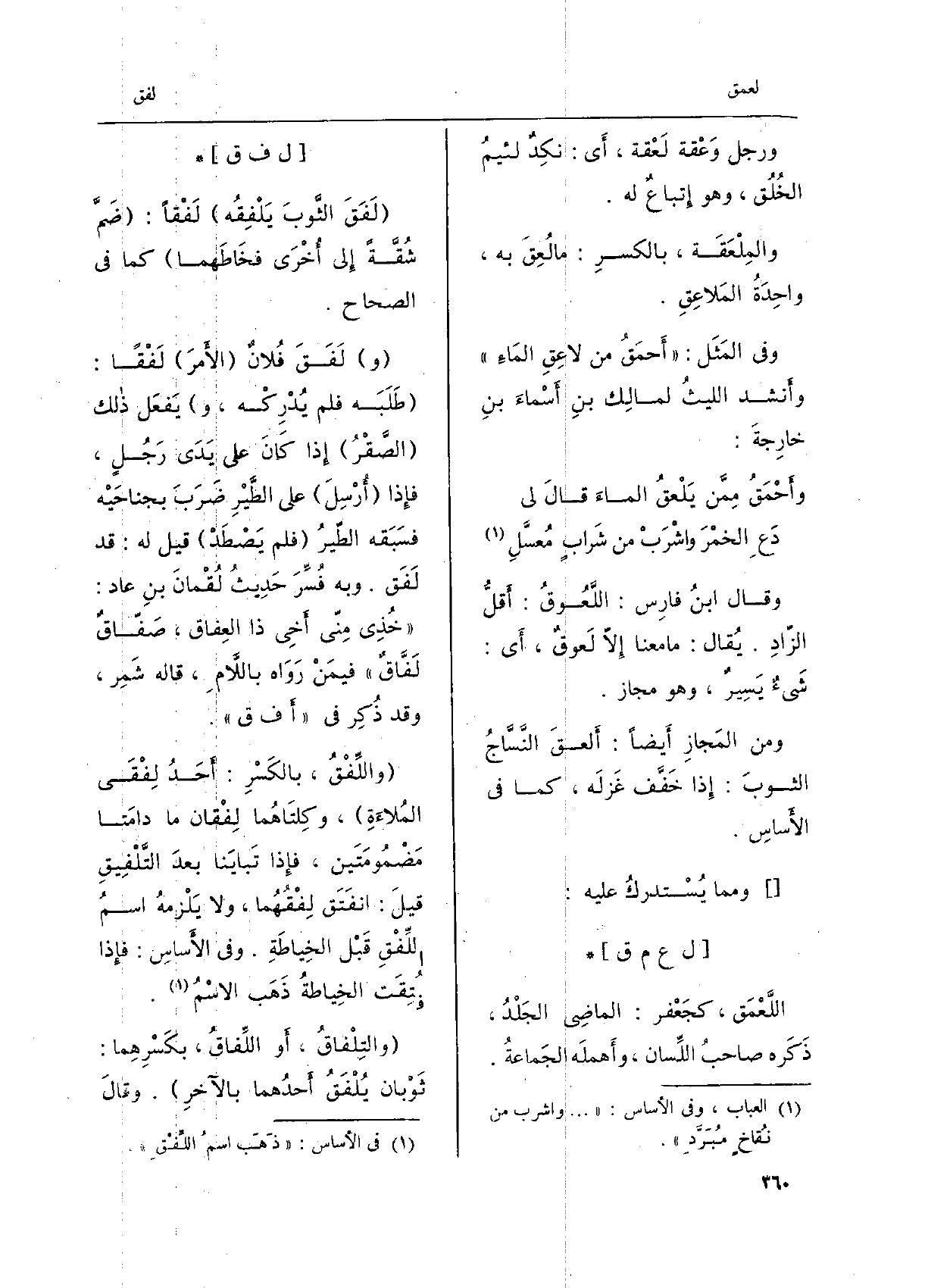 لَفَقَ الثّوبَ يلْفِقُه لَفْقاً: ضمّ شُقّةً الى أخْرى فخاطَهما كَمَا فِي الصّحاح. ولَفَقَ فُلانٌ الأمرَ لَفْقاً: طَلَبه فَلم يُدْرِكْه، ويَفعَل ذَلِك الصّقْرُ إِذا كَانَ على يَدَي رجُلٍ، فَإِذا أُرْسِل على الطّير ضَرَبَ بجناحَيْه فسَبَقه الطّيرُ فَلم يصْطَدْ قيل لَهُ: قد لَفَق. وَبِه فُسِّر حديثُ لُقْمانَ بنِ عَاد: خُذي منّي أخي ذَا العِفاق، صَفّاقٌ لَفّاقٌ فيمَنْ رَواه باللاّمِ، قَالَه شَمِر، وَقد ذُكِر فِي أُفٍّ ق. واللِّفْقُ، بالكَسْر: أحدُ لِفْقَي المُلاءَةِ، وكِلتاهُما لِفْقان مَا دامَتا مضْمومَتَين، فَإِذا تَبايَنا بعدَ التّلْفيقِ قيل: انفَتَق لِفْقُهُما، وَلَا يَلزمُهُ اسمُ اللِّفْقِ قبل الخِياطَة. وَفِي الأساس: فَإِذا فُتِقَت الخِياطةُ ذهَبَ الاسْمُ.