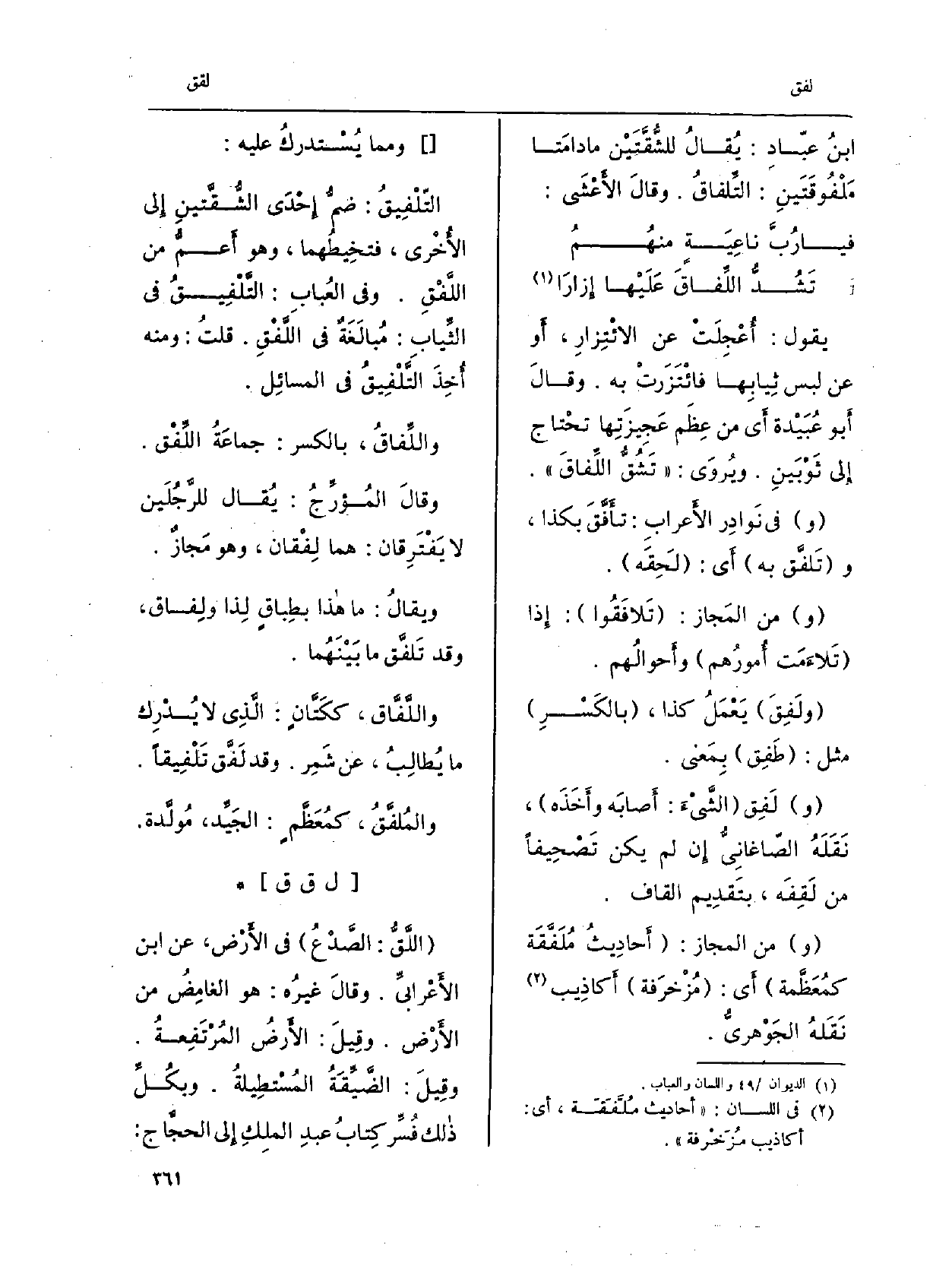يَقُول: أُعْجِلَتْ عَن الائتِزارِ، أَو عَن لبس ثِيابِها فائتَزَرتْ بِهِ. وَقَالَ أَبُو عُبيدَة أَي من عِظَم عجيزَتِها تحْتاج الى ثوْبَين. ويُروى: تشُقُّ اللِّفاقَ. وَفِي نَوادِر الْأَعْرَاب: تأفَّقَ بِكَذَا، وتلفّق بِهِ أَي: لحِقَه. وَمن المَجاز: تلافَقوا: إِذا تلاءَمَت أمورُهم وأحوالُهم. ولَفِقَ يعْمَلُ كَذَا، بالكَسْر مثل: طَفِق بمَعنى. ولَفِق الشّيْءَ: أصابَه وأخَذَه، نقَلَهُ الصاغانيُّ إِن لم يكن تصْحيفاً من لَقِفَه، بِتَقْدِيم الْقَاف. وَمن الْمجَاز: أحاديثُ مُلَفَّقَة كمُعَظَّمة أَي: مُزخْرَفة أكاذيب نقَلَهُ الجوهريّ. وَمِمَّا يُسْتَدْرَكُ عَلَيْهِ: التّلْفيقُ: ضمُّ إحْدى الشُّقّتين الى الأخْرى، فتخِيطُهما، وَهُوَ أعمُّ من اللَّفْقِ. وَفِي العُباب: التّلْفيقُ فِي الثِّياب: مُبالَغَة فِي اللَّفْقِ. قلت: وَمِنْه أُخِذَ التّلْفيقُ فِي المسائِل. واللِّفاقُ،)