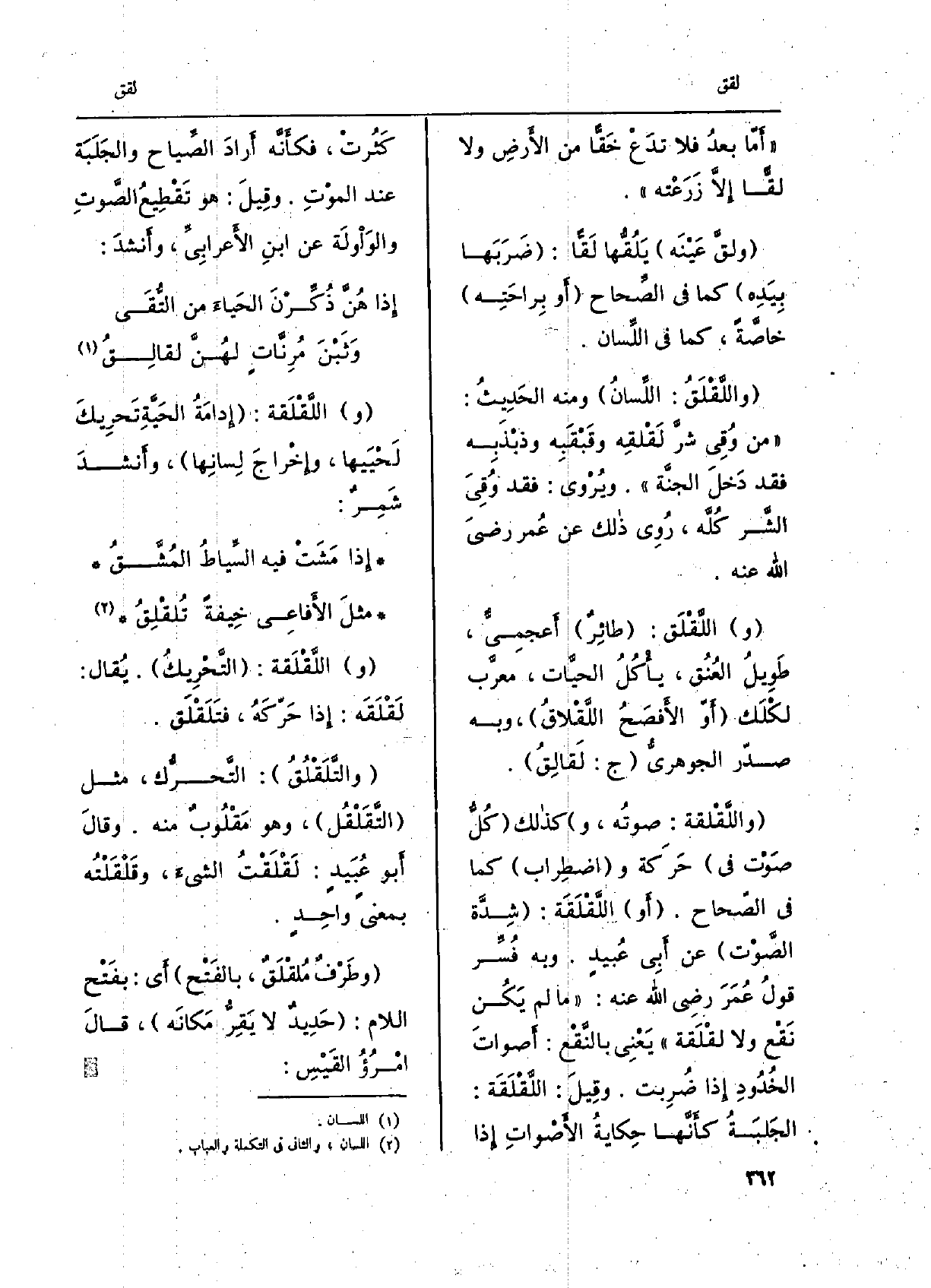 أمّا بعدُ فَلَا تدَعْ خَقّاً من الأرضِ وَلَا {لَقّاً إلاّ زرَعْته.} ولَقّ عينَه {يلُقُّها} لَقّاً: ضرَبَها بيَدِه كَمَا فِي الصِّحاح أَو براحَتِه خاصّةً، كَمَا فِي اللِّسان. {واللَّقْلَقُ: اللِّسانُ وَمِنْه الحَدِيث: من وُقِي شرَّ} لَقْلقِه وقَبْقَبِه وذبْذَبِه فقد دخَل الجنّة. ويُروى: فقد وُقِيَ الشّرّ كُلَّه، رُوِي ذَلِك عَن عُمر رَضِي الله عَنهُ. (و) {اللَّقْلَق: طائِرٌ أعجميٌّ، طَويلُ العُنُق، يأكُلُ الحيّات، معرَّب لكْلَك أَو الأفصَحُ} اللّقْلاقُ، وَبِه صدّر الجوهريُّ ج: لَقالِق. {واللّقْلقة: صوتُه، وَكَذَلِكَ كُلُّ صوْت فِي حرَكة واضطِراب كَمَا فِي الصّحاح. أَو} اللّقْلَقَة: شدّة الصّوْت عَن أبي عُبيد. وَبِه فُسِّر قولُ عُمَر رَضِي الله عَنهُ: مَا لم يكُن نقْع وَلَا {لَقْلَقة، يَعْنِي بالنّقْع: أصواتُ الخُدودِ إِذا ضُرِبَت. وَقيل: اللّقْلَقَة: الجلَبَة كأنّها حِكاية الأصْواتِ إِذا كثُرتْ، فكأنّه أرادَ الصِّياحَ والجَلَبَة عِنْد الموْت. وقيلَ: هُوَ تقْطيعُ الصّوتِ والوَلْوَلَة عَن ابنِ الأعرابيّ، وَأنْشد: