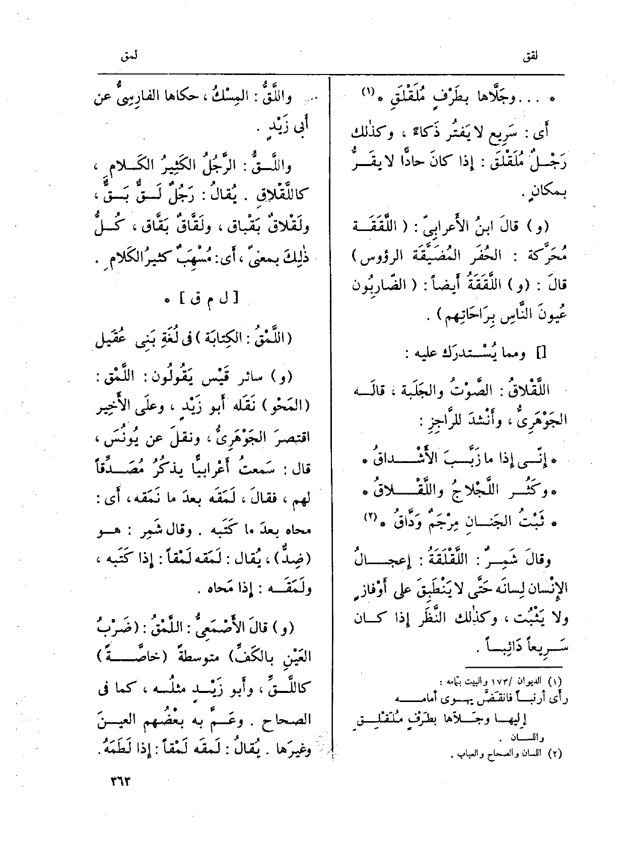اللَّمْقُ: الكِتابَة فِي لُغة بَني عُقَيل وَسَائِر قيس يَقُولُونَ: اللّمْق: المَحْو نقَله أَبُو زَيدٍ، وعَلى الْأَخير اقتصَر الجوهريُّ، ونقلَ عَن يونُس، قَالَ: سمعتُ أعْرابيّاً يذكُرُ مُصَدِّقاً لَهُم، فَقَالَ: لمَقَه بعد مَا نَمَقه، أَي: محاه بعدَ مَا كتَبه. وَقَالَ شمِر: هُوَ ضِدٌّ، يُقال: لمَقه لمْقاً: إِذا كتبَه، ولَمَقَه: إِذا مَحاه.