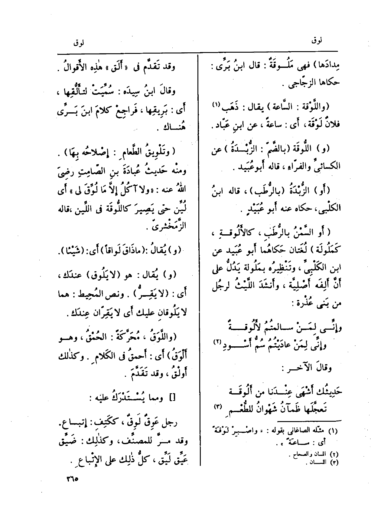 وَقد تقدّم فِي ألَق هَذِه الْأَقْوَال. وَقَالَ ابنُ سيدَه: سُمّيَت لتألُّقِها، أَي: بَريقِها، فراجِعْ كلامَ ابنَ برّي هُناك.} وتلْويقُ الطّعام: إصْلاحُه بِها. ومنْه حديثُ عُبادَة بنِ الصّامِتِ رضِيَ الله عَنهُ: وَلَا آكُلُ إِلَّا مَا {لُوِّقَ لي أَي لُيِّن حَتَّى يَصير} كاللُّوقَة فِي اللّين، قَالَه الزّمخشري. ويُقال: مَا ذاقَ {لَواقاً أَي: شَيْئاً. ويُقال: هُوَ لَا} يَلوق عندَك، أَي: لَا يَقِرُّ. وَنَصّ المُحيط: هما لَا {يَلوقانِ عَلَيْك أَي لَا يَقِرّان عندَك.} واللَّوَق، مُحرّكةً: الحُمْق، وَهُوَ {ألْوَقُ أَي: أحمقُ فِي الكَلامِ. وَكَذَلِكَ أولقُ، وَقد تقدّم. وَمِمَّا يُسْتَدْرَكُ عَلَيْهِ: رجل عَوِقٌ} لَوِقٌ، ككتِف: إتعباع. وَقد مرّ للمصنِّف، وَكَذَلِكَ: ضَيِّق عيِّق! لَيِّق، كلّ ذلِك على الإتْباع.
