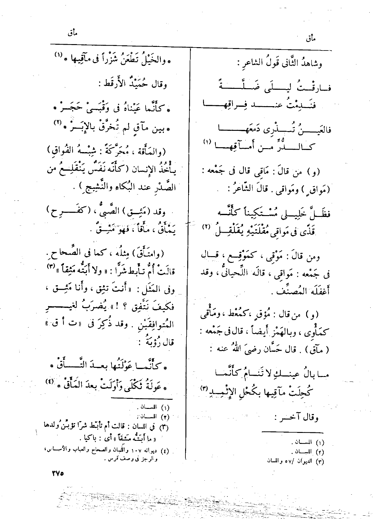 والخَيْلُ تطْعَنُ شَزْراً فِي مآقِيها وَقَالَ حُميْدٌ الأرقَط: كأنّما عيْناهُ فِي وَقْبَيْ حَجَرْ بينَ مآقٍ لم تُخرَّقْ بالإبَرْ} والمأَقة، مُحرّكةً: شِبْهُ الفُواقِ يأخُذُ الْإِنْسَان كأنّه نفَسٌ ينقَلِعُ من الصّدْرِ عِنْد البُكاءِ والنّشيج. وَقد {مَئِق الصّبيُّ، كفَرِح} يمْأَقُ، {مأَقاً، فَهُوَ} مَئِقٌ. {وامتأَقَ مثلُه، كَمَا فِي الصِّحاح. قَالَت أمّ تأبط شرّاً: وَلَا أبَتُّه} مَئِقاً، وَفِي المثَل: أنتَ تئِق، وَأَنا مَئِق، فَكيف نتّفِق يُضرَبُ لغير المُتوافِقَيْن. وَقد ذُكِر فِي ت أق قَالَ رؤبة: كأنّما عوْلَتُها بعدَ التّأَقْ عَولَةُ ثَكْلَى ولْوَلَتْ بعدَ! المأَقْ