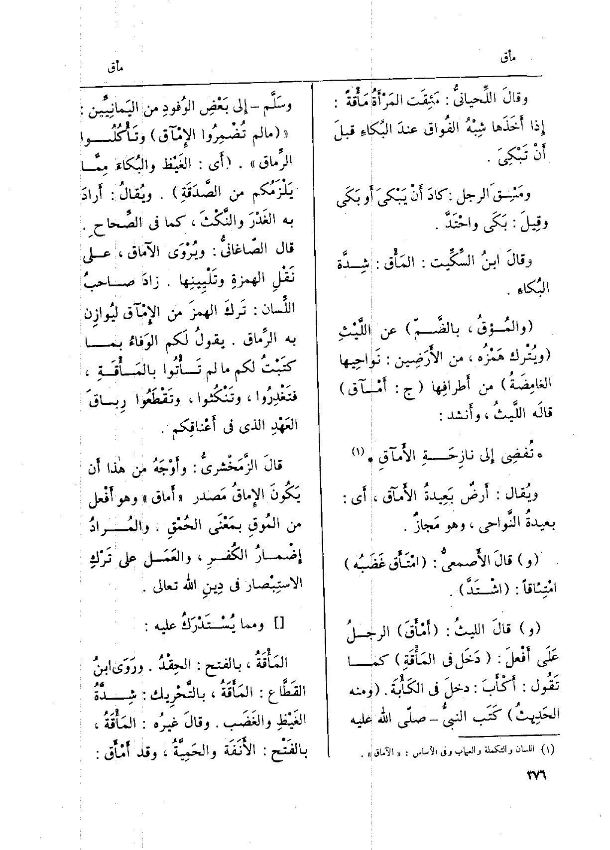 زَاد صاحبُ اللّسان: تركَ الْهَمْز من الإمْآق ليوازِن بِهِ الرِّماق. يَقُول لكم الوَفاءُ بِمَا كتبْتُ لكم مَا لم تأْتُوا {بالمَأْقَةِ، فتَغْدِروا، وتنْكُثوا، وتَقْطَعوا رِباقَ العهْدِ الَّذِي فِي أعْناقِكم. قَالَ الزّمخشَريّ: وأوْجَهُ من هَذَا أَن يكونَ} الإماقُ مصدر {أماق وَهُوَ أفْعل من} المُوقِ بمعْنى الحُمْقِ. والمُرادُ إضْمارُ الكُفرِ، والعَمَل على ترْك الاستِبْصار فِي دِين الله تَعَالَى. وَمِمَّا يُسْتَدْرَكُ عَلَيْهِ: {المَأْقَةُ، بِالْفَتْح: الحِقْدُ. وروَى ابنُ القَطّاع:} المأَقَةُ، بالتّحريك: شدّةُ الغيْظِ والغضَب. وَقَالَ غيرُه: {المأْقَةُ،)