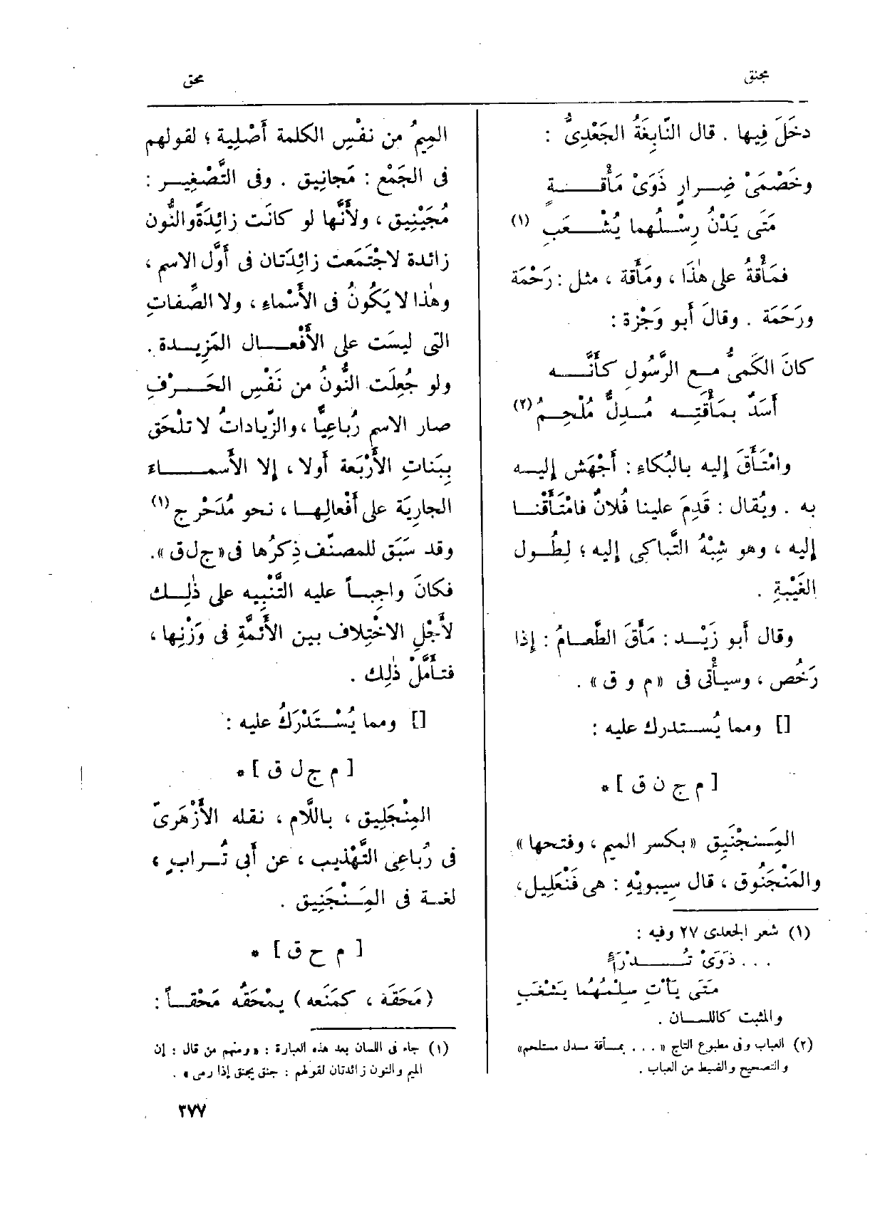 المَِنجَنيق بِكَسْر الْمِيم، وَفتحهَا والمَنْجَنوق، قَالَ سيبَوَيْه: هِيَ فَنْعَليل، المِيمُ من نفْسِ الْكَلِمَة أصْلية لقَولهم فِي الجمْع: مَجانيق. وَفِي التّصْغير: مُجَيْنيق، ولأنّها لَو كانَت زائِدَةً والنّون زَائِدَة لاجْتَمَعت زائِدَتان فِي أوّل الِاسْم، وَهَذَا لَا يَكونُ فِي الأسْماءِ، وَلَا الصِّفاتِ الَّتِي لَيست على الْأَفْعَال المَزيدة. وَلَو جُعِلَت النّونُ من نفْسِ الحرْفِ صَار الِاسْم رُباعيّاً، والزّياداتُ لَا تلْحَق ببَناتِ الأرْبَعة أَولا، إِلَّا الأسماءَ الجارِيَة على أفْعالِها، نَحْو مُدَحْرج وَقد سَبَق للمصنِّف ذكرُها فِي ج ل ق. فَكَانَ واجِباً عَلَيْهِ التّنْبيه على ذلِك لأجْلِ الاخْتِلاف بَين الأئمّة فِي وزْنِها، فتأمّل ذَلِك. وَمِمَّا يُسْتَدْرَكُ عَلَيْهِ: