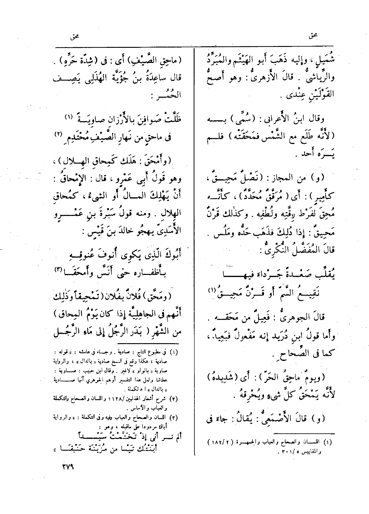 قَالَ الجوهريّ: فَعيلٌ من مَحَقه. وَأما قولُ ابنِ دُريد إنّه مَفْعولٌ فبَعيدٌ، كَمَا فِي الصِّحاح. ويومٌ ماحِقُ الحَرّ: أَي شَديدهُ لأنّه يمْحَقُ كلّ شيءٍ ويُحْرِقه. وَقَالَ الأصمعيّ: يُقال: جاءَ فِي ماحِقِ)