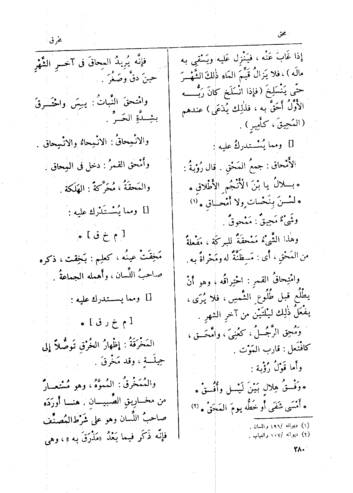 إِذا غابَ عنْه، فينزِل عَلَيْهِ ويسْقي بِهِ مالَه، فَلَا يَزالُ قيِّمَ الماءِ ذلكَ الشّهْرَ حتّى ينسلِخَ فَإِذا انْسَلَخ كَانَ ربُّه الأوّلُ أحَقَّ بِهِ، فذلِك يُدْعى عِنْدهم المَحيقَ، كأميرٍ. وَمِمَّا يُسْتَدْرَكُ عَلَيْهِ: الأمْحاق: جمعُ المَحْقِ. قَالَ رؤبةُ: بلالُ يَا بْنَ الأنْجُمِ الأطْلاقِ لسْنَ بنَخْساتٍ وَلَا أمْحاقِ وشيءٌ مَحيقٌ: ممْحوقٌ. وَهَذَا الشيءُ مَمْحقَةٌ للبركَة، مَفْعلةٌ من المَحْقِ، أَي: مظِنّةٌ لَهُ ومَحْراةٌ بِهِ. وامْتِحاقُ القمرِ: احتِراقُه، وَهُوَ أَن يطلُع قبل طُلوعِ الشّمْسِ، فَلَا يُرَى، يفْعَلُ ذلِك ليلَتيْن من آخِر الشهرِ. ومُحِق الرّجُلُ، كعُنِيَ، وامّحَق، كافْتَعل: قَارب الْمَوْت. وَأما قَول رؤبة: وَفْقُ هِلالٍ بينَ ليْل وأُفُقْ أَمْسَى شَفَى أَو خَطُّه يومَ المحَقْ فإنّه يُريدُ المِحاقَ فِي آخرِ الشّهْرِ حينَ دقَّ وصَغُرَ. وامْتَحَق النّباتُ: يبِسَ واحْترَق بشدّةِ الحرِّ.