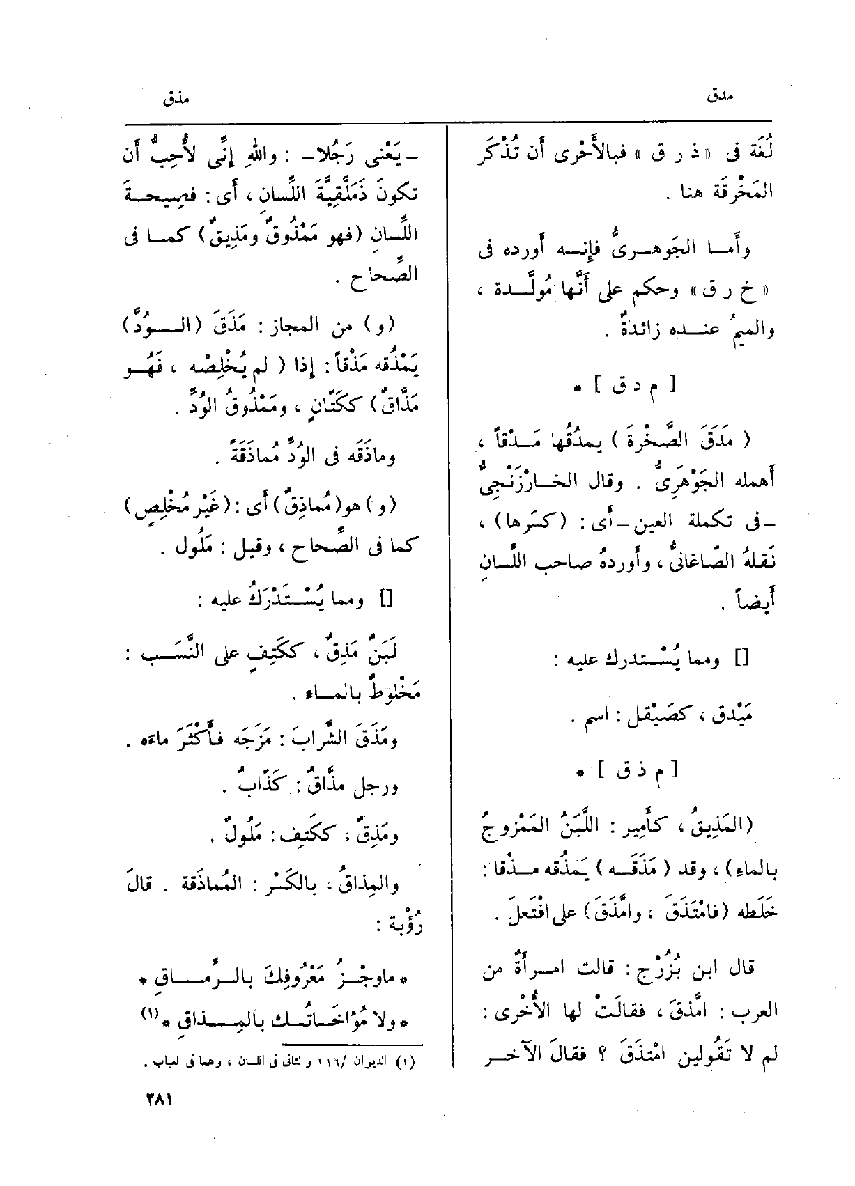قَالَ ابنُ بُزُرْج: قَالَت امرأةٌ من الْعَرَب: امّذقَ، فقالَتْ لَهَا الْأُخْرَى: لم لَا تَقولين امْتَذَقَ فقالَ الآخر يعْني رجُلاً: واللهِ إِنِّي لأُحِبُّ أَن تكونَ ذَمَلَّقِيّةَ اللِّسان، أَي: فصيحةَ اللِّسان فَهُوَ مَمْذوقٌ ومَذيقٌ كَمَا فِي الصِّحاح. وَمن الْمجَاز: مذَقَ الوُدَّ يمْذُقه مذْقاً: إِذا لم يُخْلِصْه، فَهُوَ مذّاقٌ ككَتّان، ومَمْذوقُ الوُدِّ. وَهُوَ مُماذِقٌ أَي: غيْر مُخلِصٍ كَمَا فِي الصِّحاح، وَقيل: مَلول. وَمِمَّا يُسْتَدْرَكُ عَلَيْهِ: لبَنٌ مذِقٌ، ككتِفٍ على النّسب: مخْلوطٌ بالماءِ. ومذَقَ الشّرابَ: مزجَه فأكْثَرَ ماءَه. وَرجل مذّاقٌ: كذّابٌ. ومذِقٌ، ككتِف: مَلولٌ. والمِذاقُ، بالكسْر: المُماذَقة. قَالَ رؤبة: مَا وجْزُ معْروفِكَ بالرِّماقِ وَلَا مُؤاخاتُك بالمِذاقِ