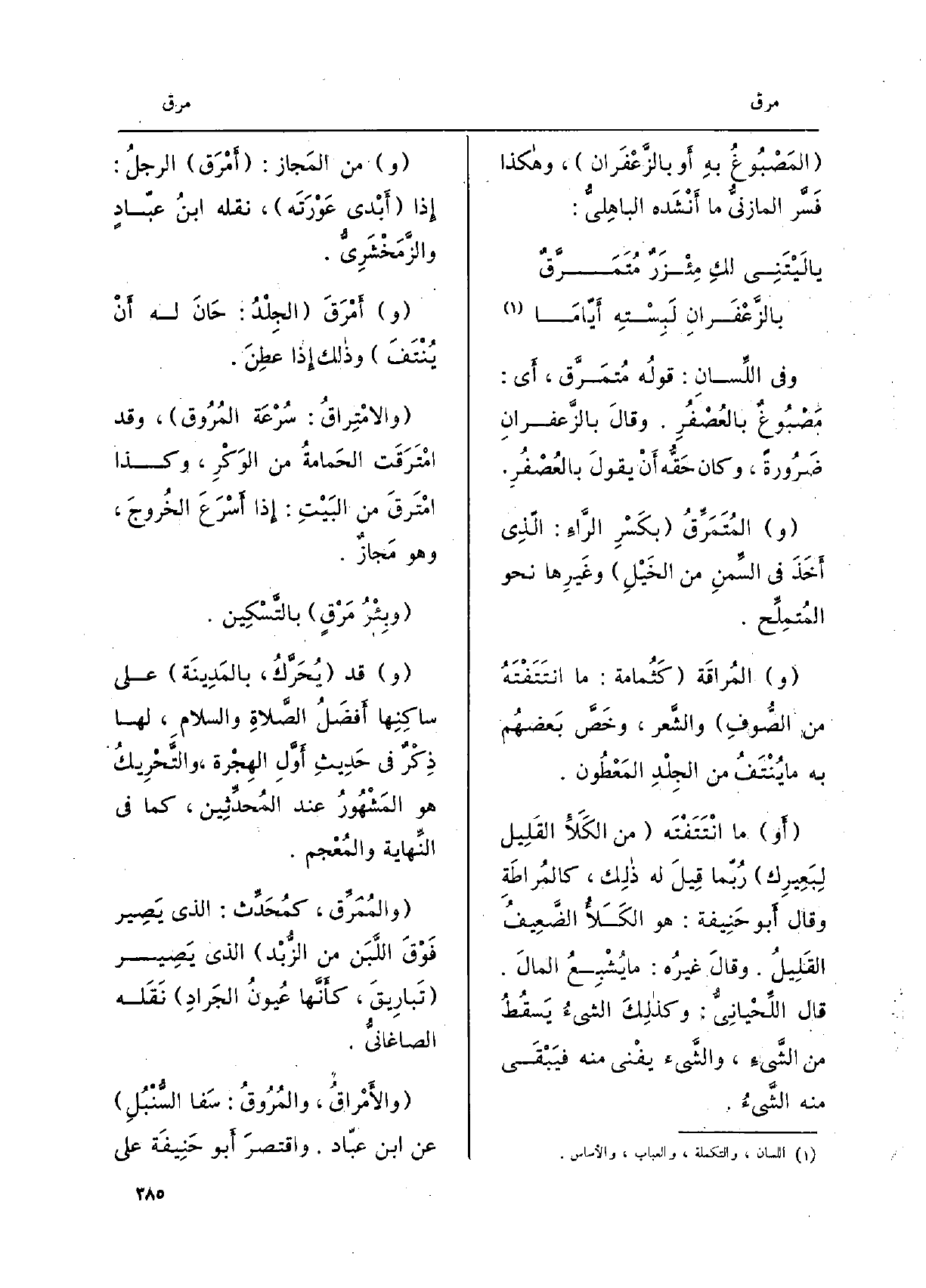 والمُمَرِّق، كمُحَدِّث: الَّذِي يَصير فوْقَ اللّبَن من الزُّبْد الَّذِي يَصير تبارِيقَ، كأنّها عُيونُ الجَرادِ نقَله الصاغانيّ. والأمْراقُ، والمُروقُ: سَفا السُّنْبُلِ عَن ابْن عبّاد. (سقط: من نِهَايَة الصفحة رقم (385) حَتَّى نِهَايَة الصفحة رقم (387) .)