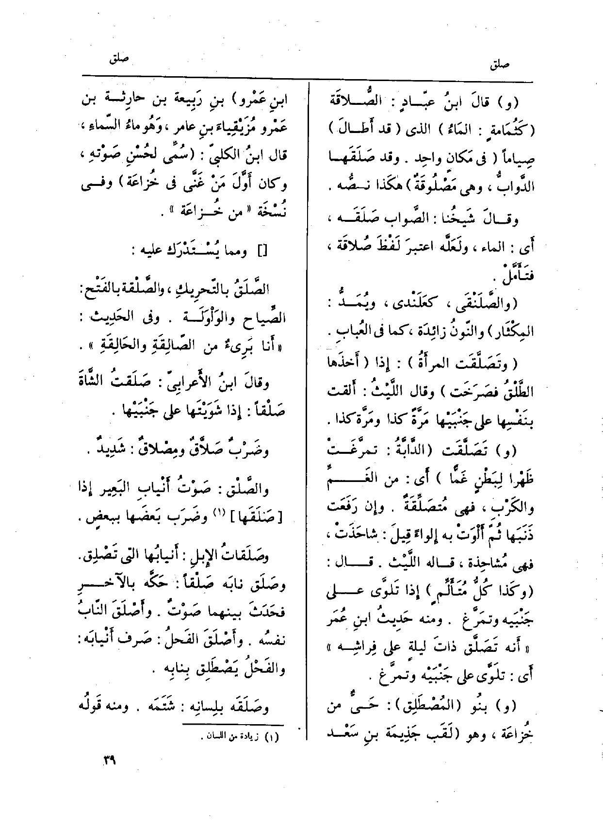 وَمِنْه حديثُ ابنِ عُمَر أَنه تصلّقَ ذاتَ ليلةٍ على فِراشِه أَي: تلوّى على جنْبَيْه وتمرّغ. وَبَنُو المُصْطَلِق: حيٌّ من خُزاعَة، وَهُوَ لقَب جَذيمَة بنِ سعْد بنِ عَمْرو بنِ رَبيعة بن حارِثة بن عَمْرو مُزَيْقِياءَ بنِ عامِر، وَهُوَ ماءُ السّماءِ، قَالَ ابنُ الكلبيّ: سُمّيَ لحُسْنِ صوْتِه، وَكَانَ أوّلَ مَنْ غنّى فِي خُزاعَة وَفِي نُسْخَة من خُزاعَة. وَمِمَّا يُسْتَدرَك عَلَيْهِ: الصَّلَقُ بالتّحريكِ، والصّلْقة بالفَتْح: الصِّياح والوَلْوَلَة. وَفِي الحَدِيث: أَنا بَريءٌ من الصّالِقَة والحالِقَة. وَقَالَ ابنُ الْأَعرَابِي: صَلَقتُ الشّاةَ صَلْقاً: إِذا شوَيْتَها على جَنْبَيْها. وضرْبٌ صَلاّقٌ ومِصْلاقٌ: شَديدٌ. والصّلْق: صوْتُ أنْيابِ البَعير إِذا صَلَقَها وضرَب بعضَها ببعضٍ. وصَلَقاتُ الإبلِ: أنيابُها الَّتِي تصْلِق. وصَلَق نابَه صَلْقاً: حكّه بالآخرِ فحدَثَ بَينهمَا صوْتٌ. وأصْلَقَ النّابُ نفسُه. وأصْلَقَ الفحلُ: صرف أنْيابَه: والفَحْلُ يصْطَلِق بنابِه. وصَلَقَه بلِسانِه: شتَمَه. وَمِنْه قولُه