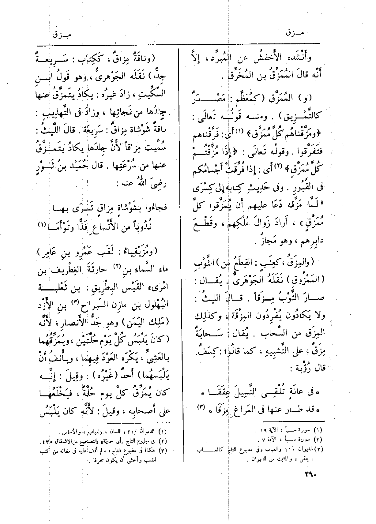 وأَنْشَده الأَخفشُ عَن المُبرِّد، إِلاَّ أَنّه قالَ المُمَزَّقُ بن المُخَرِّق. (و) المُمَزَّق (كمُعَظَّم: مَصْدَرٌ كالتَّمْزِيق) . وَمِنْه قَولُه تَعالَى: {ومزقناهم كل ممزق} أَى: فُرِّقْناهم فتَفَرَّقوا. وقولُه تَعالَى: {إِذا مزقتم كل ممزق} أَى: إِذا فُرِّقَتْ أَجْسامُكم فِي القُبُورِ. وَفِي حَدِيثِ كِتابه إِلى كِسْرَى " لَمَّا مَزَّقه دَعَا عَلَيْهِم أَن يُمَزَّقوا كلَّ مُمَزَّقٍ "، أَرادَ زَوالَ مُلْكِهم، وقَطْعَ دابِرِهم، وَهُوَ مَجازٌ. (والمِزَقُ، كعِنَبٍ: القِطَعُ من) الثَّوْبِ (المَمْزُوقِ) نَقَلَهُ الجَوْهَرىُّ. يُقال: صارَ الثَّوْبُ مِزَقاً. قالَ الليثُ: وَلَا يَكادُون يُفْرِدُون المِزْقَة، وكذلِك المِزَق من السَّحاب. يُقال: سَحابَةٌ مِزَقٌ، على التَّشبِيهِ، كَمَا قالُوا: كِسَفٌ. قَالَ رُؤْبة: