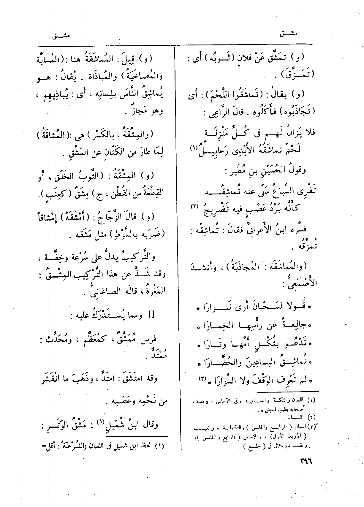 فسّره ابنُ الأعرابيّ فَقَالَ: تُماشِقُه: تمزِّقه. والمُماشَقَة: المُجاذَبَةُ، وأنشدَ الأصْمَعيّ: قُولا لسَحْبانَ أرى نَوارا جالِعةً عَن رأسِها الخِمارا تدْعو بثُكْلٍ أمَّها وتَارا تُماشِقُ البادِينَ والحُضّارا لم تعْرِف الوقْفَ وَلَا السِّوارا وَقيل: المُماشَقَةُ هُنَا: المُسابّة والمُصاخَبَةُ والمُباذاة. يُقال: هُوَ يماشِقُ النّاسَ بلِسانِه، أَي: يُباذِيهِم، وَهُوَ مَجازٌ. والمِشْقَةُ، بالكسْر هِيَ: المُشاقَةُ لِما طارَ من الكتّانِ عَن المشْقِ. والمِشْقَة: الثّوبُ الخلَق، أَو القِطعَة من القُطْن، ج مِشَقٌ كعِنَبٍ. وَقَالَ الزّجّاجُ: أمْشَقَهُ إمْشاقاً ضرَبَه بالسّوطِ مثل مشَقه. والتّركيبُ يدلُّ على سُرعة وخِفّة، وَقد شذّ عَن هَذَا التّرْكيب المِشْقُ: المَغْرةُ، قالَه الصاغانيّ. وَمِمَّا يُسْتَدْرَكُ عَلَيْهِ: فرس مُمَشَّقٌ، كمُعَظَّم، ومُحَدِّث: مُمْتَدٌّ. وَقد امتَشَق: امتدّ، وذهَب مَا انْقَشَر من لحْمِه وعصَبه. وَقَالَ ابنُ شُمَيل: مشْقُ الوَتَرِ: