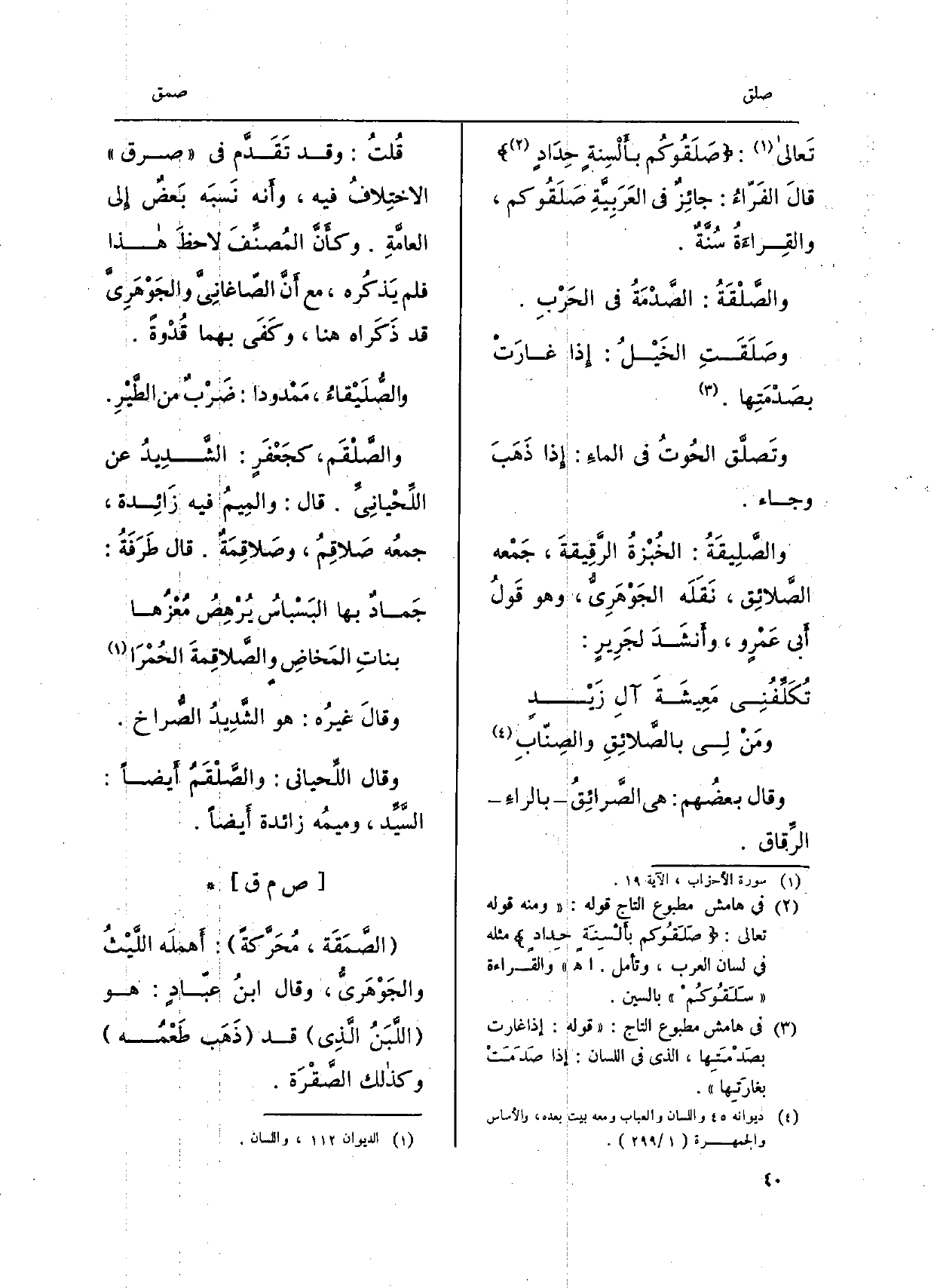 تَعالى:) صلَقوكُم بألْسِنَةٍ حِدادٍ (قَالَ الفرّاءُ: جائِزٌ فِي العربيّة صَلَقوكم، والقِراءَةُ سُنّةٌ. والصّلْقَة: الصّدْمَةُ فِي الحَرْب. وصَلَقَتِ الخيْلُ: إِذا غارَتْ بصَدْمَتِها. وتصلّق الحوتُ فِي الماءِ: إِذا ذهَب وَجَاء. والصّليقَةُ: الخُبْزةُ الرّقيقة، جمْعه الصّلائِق، نقلَه الجوْهَريُّ، وَهُوَ قولُ أبي عَمْرو، وأنشَدَ لجَرير: