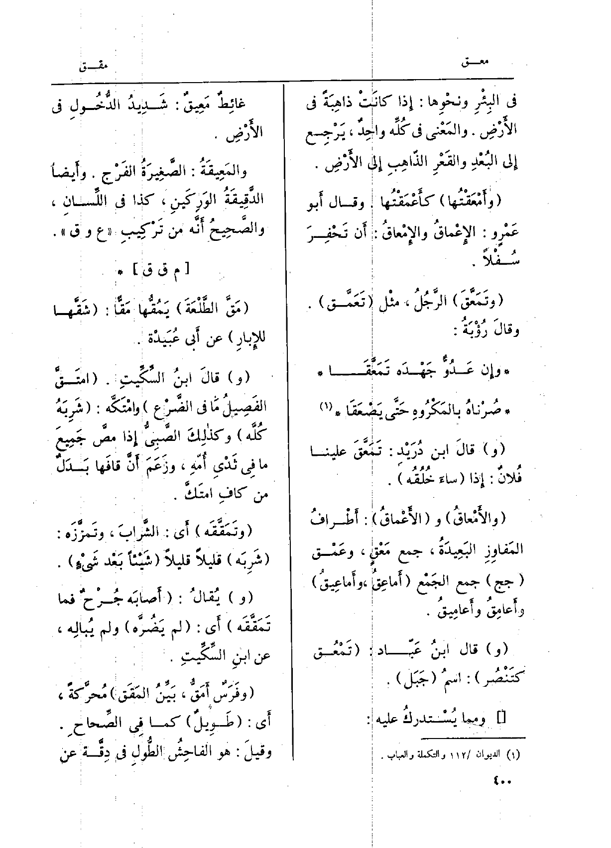 وتمعَّقَ الرّجُلُ، مثل تعمّق. وَقَالَ رؤبة: وَإِن عَدُوٌّ جهْدَه تمعَّقا صُرْناهُ بالمَكْروهِ حتّى يصْعَقا وَقَالَ ابنُ دُريد: تمعّقَ علينا فُلانٌ: إِذا ساءَ خُلُقُه. والأمْعاقُ والأعْماقُ: أطْرافُ المَفاوِزِ البَعيدةُ، جمع معْقٍ، وعَمْق جج جمع الجمْع أماعِقُ، وأماعِيق وأعامِقُ وأعاميقُ. وَقَالَ ابنُ عبّاد: تمْعُق كتَنْصُر: اسمُ جبَل. وَمِمَّا يُسْتَدْرَكُ عَلَيْهِ: غائِطٌ مَعيقٌ: شديدُ الدّخولِ فِي الأرْض. والمَعيقَة: الصّغيرةُ الفرْج. وَأَيْضًا الدّقيقة الوَرِكَين، كَذَا فِي اللِّسان، والصّحيح أنّه من ترْكيب ع وق.
