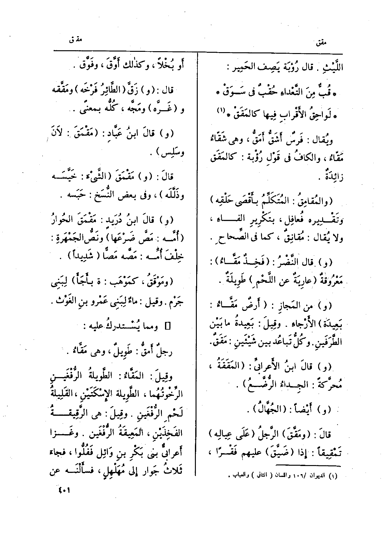 اللّيثِ. قَالَ رؤبة يصِفُ الحَمير: قُبٌّ من التّعْداءِ حُقْبٌ فِي سَوَقْ لَواحِقُ الأقْرابِ فِيهَا {كالمَقَقْ وَيُقَال: فرسٌ أشَقُّ} أمَقُّ، وَهِي شَقّاءُ {مَقّاءُ، والكافُ فِي قوْلِ رؤْبة: كالمَقَق زائِدَة.} والمُقامِقُ: المتكلّم بأقْصى حَلْقِه وتقْديره فُعافِل، بتكْرير الفاءِ، وَلَا يُقال: مُقانِقٌ، كَمَا فِي الصِّحاح. وَقَالَ النّضْرُ: فخِذٌ مقّاءُ: معروقةٌ عارِيَةٌ من اللّحْمِ طويلَةٌ. وَمن المجازِ: أرضٌ مقّاءُ: بعيدَة الأرْجاءِ.