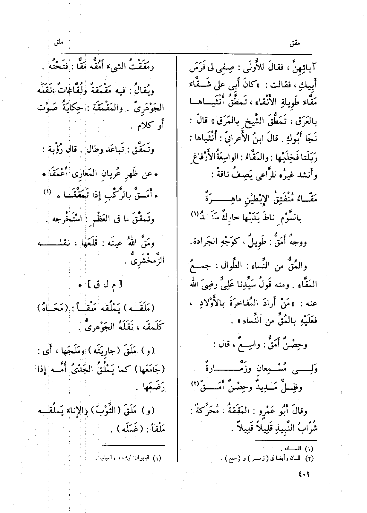 آبائِهنّ، فَقَالَ للأولى: صِفي لي فرَسَ أبيكِ، فَقَالَت: كَانَ أبي على شَقّاءَ مقّاءَ طويلَةِ الأنْقاءِ، تمطَّقُ أُنْثَياها بالعَرَق، تمطُّقَ الشّيخِ بالمرَق، قَالَ: نَجا أَبوك. قَالَ ابْن الأعرابيّ: أُنْثَياها: رَبَلَتا فخِذَيْها: والمَقّاءُ: الواسِعَةُ الأرْفاغِ وَأنْشد غيرُه للرّاعي يصفُ نَاقَة: