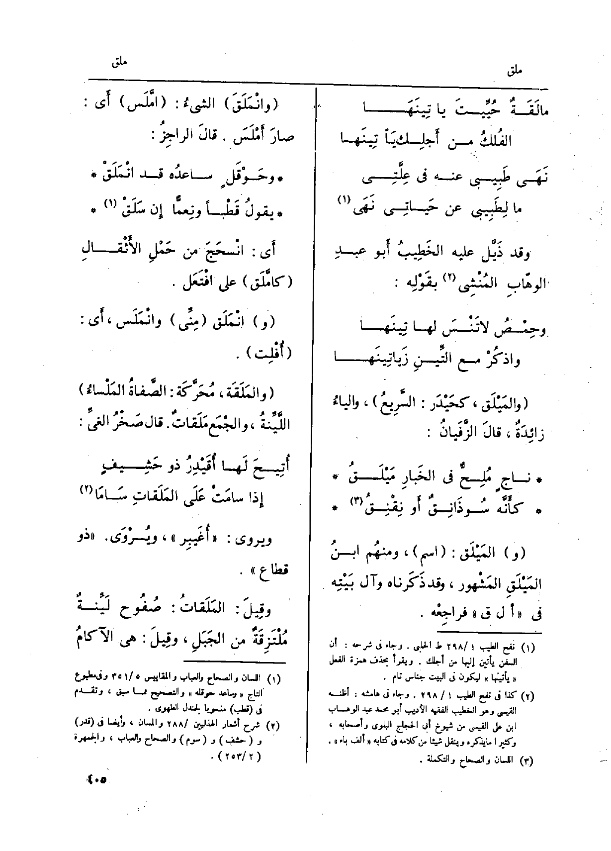 والميْلَق: اسْم، ومنهُم ابنُ الميْلَق المشْهور، وَقد ذكرْناه وَآل بيتِه فِي أل ق فراجِعْه. وانْمَلَق الشيءُ: امّلس أَي: صارَ أمْلَس. قَالَ الراجز: وحوْقَلٍ ساعدُه قد انْمَلَقْ يَقُول قَطْباً ونِعماً إِن سلَقْ أَي: انْسحَجَ من حمْلِ الأثْقالِ كامّلَق على افْتَعَل. وانْمَلَق منّي وانْملَس، أَي: أُفلِت. والمَلَقَة، مُحرّكة: الصّفاةُ الملْساءُ اللّيِّنة، والجمْعُ ملَقاتٌ. قَالَ صخْرُ الغيِّ: