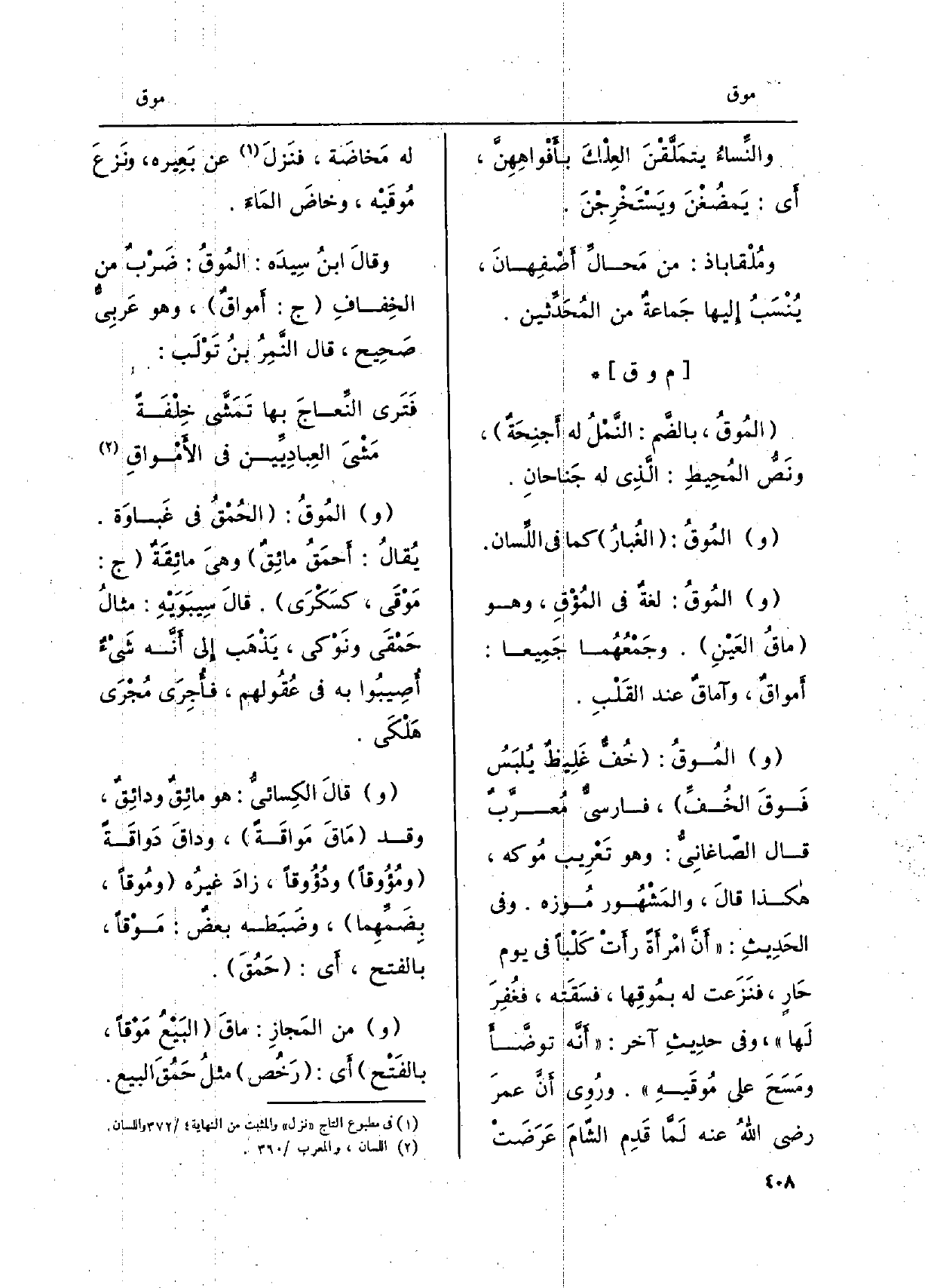 والمُوق: خُفٌّ غليظٌ يُلبَسُ فوقَ الخُفِّ، فارسيٌّ معرَّب قَالَ الصاغانيّ: وَهُوَ تعْريب مُوكه، هَكَذَا قَالَ، والمشْهور موزه. وَفِي الحَدِيث: أنّ امْرأةً رأتْ كلْباً فِي يَوْم حارٍ، فنزَعت لَهُ {بموقِها، فسَقَته، فغُفِرَ لَهَا، وَفِي حَدِيث آخر: أنّه توضّأ ومسَح على} موقَيْه. ورُوِي أنّ عمرَ رَضِي الله عَنهُ لمّا قدِم الشّامَ عرَضَتْ لَهُ مَخاضَة، فَنزل عَن بعيره، ونزَع موقَيْه، وخاضَ الماءَ. وَقَالَ ابنُ سيدَه: {المُوقُ: ضرْبٌ من الخِفافِ ج: أمواقٌ، وَهُوَ عربيٌّ صَحِيح، قَالَ النّمِرُ بنُ توْلَب:
