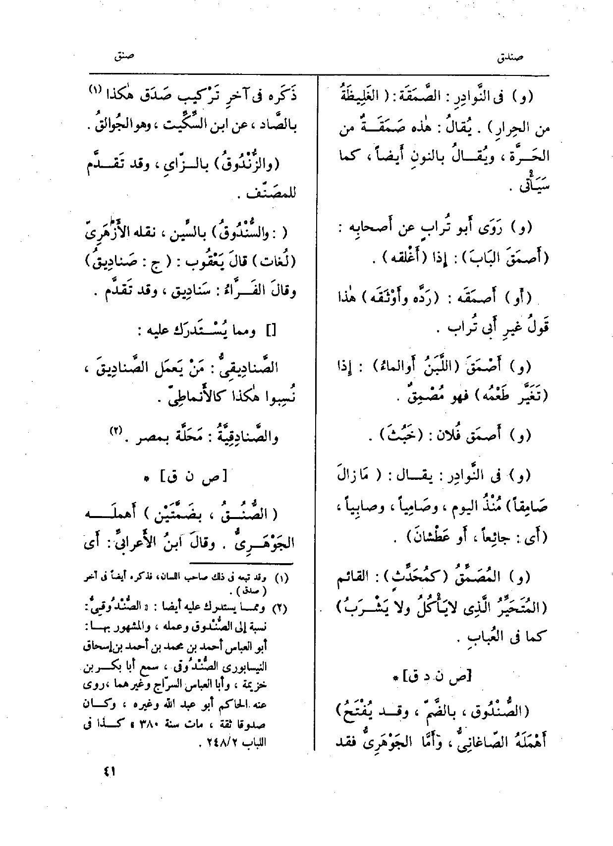 الصُّنْدوق، بالضّمّ، وَقد يُفْتَح أهمَلَهُ الصّاغانيّ، وأمّا الجوهَريّ فقد ذكَره فِي آخرِ ترْكيب صَدَق هَكَذَا بالصّاد، عَن ابْن السِّكّيت، وَهُوَ الجُوالقُ. والزُّنْدوقُ بالزّاي، وَقد تقدّم للمصنّف. والسُّنْدوقُ بالسّين، نَقله الأزْهَري لُغات قالَ يَعْقُوب: ج: صَناديقُ وَقَالَ الفرّاءُ: سَناديق، وَقد تقدّم. وَمِمَّا يُستدرَك عَلَيْهِ: الصّناديقيُّ: مَنْ يَعمَل الصّناديقَ، نُسِبوا هَكَذَا كالأنْماطيّ. والصّنادِقيّة: محَلّة بِمصْر.