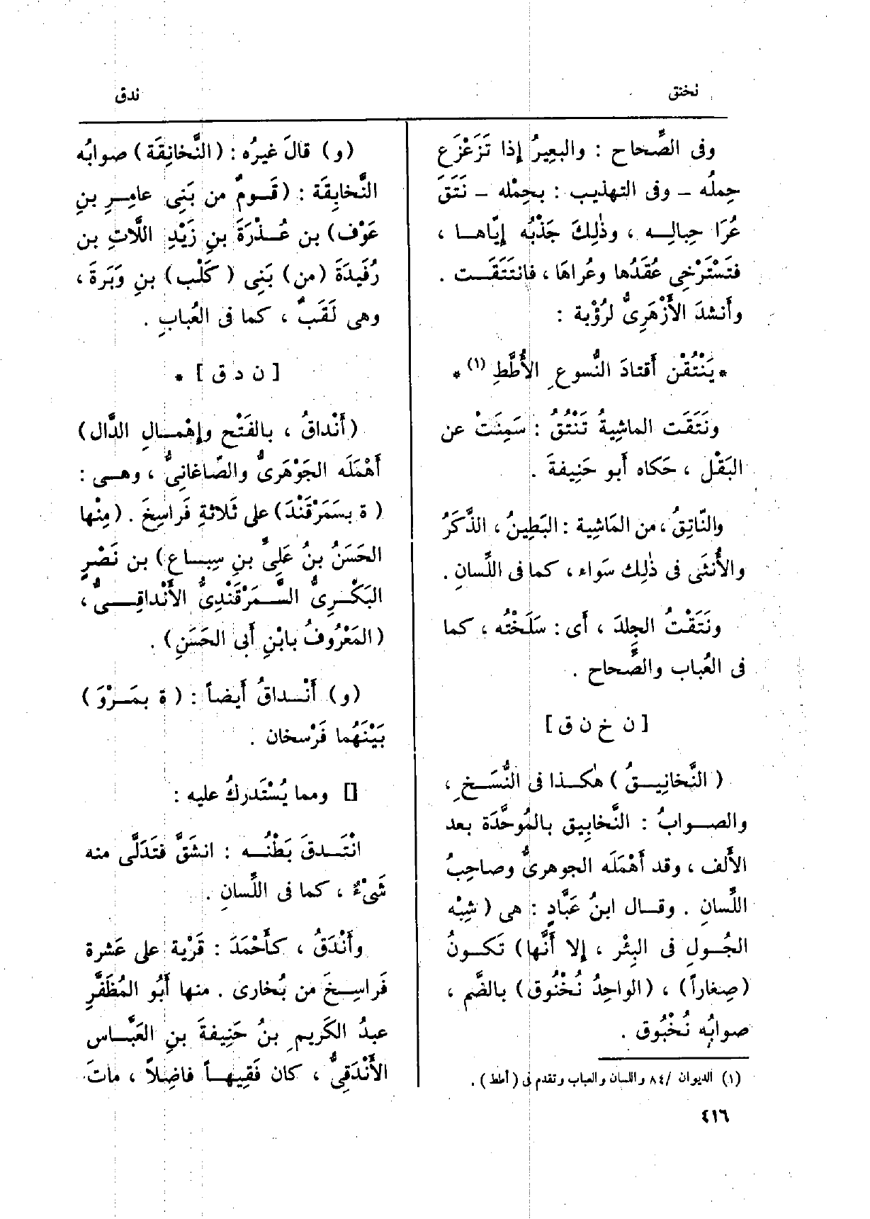 النّخانِيقُ هَكَذَا فِي النُّسَخ، والصوابُ: النّخابِيق بالمُوحَّدَة بعد الْألف، وَقد أهْمَلَه الجوهريُّ وصاحِبُ اللِّسان. وَقَالَ ابنُ عبّادٍ: هِيَ شِبْه الجُولِ فِي البِئْر، إِلَّا أَنَّهَا تكون صِغاراً، الواحِدُ نُخْنوق بالضمِّ، صوابُه نُخْبوق. وَقَالَ غيرُه: النّخانِقَة صوابُه النّخابِقَة: قومٌ من بَني عامِرِ بنِ عوْف بن عُذْرَةَ بنِ زيْدِ اللاّتِ بن رُفَيدَةَ من بَني كلْب بنِ وبَرَة، وَهِي لَقَبٌ، كَمَا فِي العُباب.