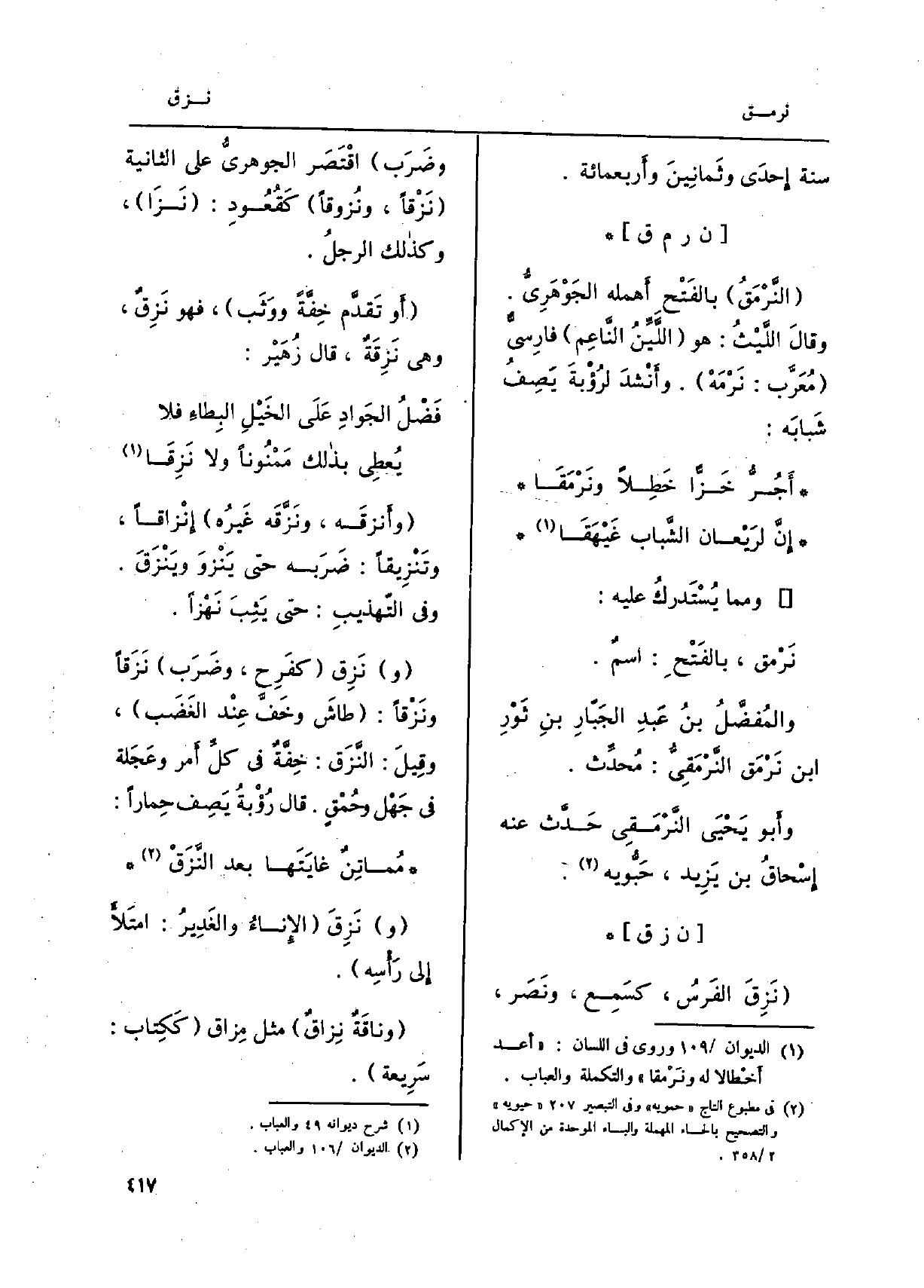 النّرْمَق بالفتْح أهمله الجوهريّ. وَقَالَ اللّيثُ: هُوَ اللَّيِّنُ النّاعِم فارسيٌّ معرَّب: نرْمَهْ. وأنشدَ لرؤْبةَ يصِفُ شبابَه: أجُرُّ خَزّاً خَطِلاً ونرْمَقا إنّ لرَيْعان الشّباب غيْهَقا وَمِمَّا يُسْتَدْرَكُ عَلَيْهِ: نرْمق، بالفتْح: اسمٌ. والمفضَّلُ بنُ عبدِ الجبّار بنِ ثوْر بن نرْمَق النّرْمَقيُّ: مُحدِّث. وَأَبُو يحْيَى النّرْمَقي حدّث عَنهُ إسْحاقُ بن يَزيد، حَبُّويه.