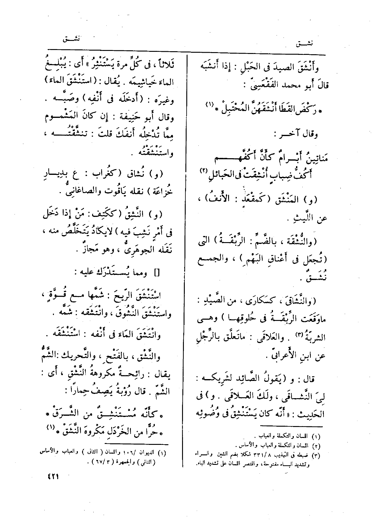والعَلاقَى: مَا تعلّق بالرِّجْلِ عَن ابنِ الأعرابيّ. قَالَ: وَيَقُول الصائِد لشَريكِه: ليَ النّشاقَى، ولكَ العَلاقَى. وَفِي الحَدِيث: أنّه كَانَ يسْتَنْشِقُ فِي وُضوئِه ثَلاثاً، فِي كلِّ مرّة يسْتَنْثِرُ أَي: يُبْلِغُ الماءَ خَياشيمَه. يُقال: استَنْشَقَ الماءَ وغيرَه: أدخَلَه فِي أنْفِه وصبّه. وَقَالَ أَبُو حنيفَة: إِن كانَ المَشْموم ممّا تُدْخِلُه أنفَكَ قلت: تنشّقْتُه، واستَنْشَقْتُه. ونُشاق كغُراب: ع بدِيار خُزاعَة نَقله ياقوت والصاغانيّ. والنَّشِقُ ككتِف: مَنْ إِذا دخَل فِي أمرٍ نشِبَ فِيهِ لَا يكادُ يتخلّصُ مِنْهُ، نقَله الجوهريُّ، وَهُوَ مَجاز. وَمِمَّا يُسْتَدْرَكُ عَلَيْهِ: اسْتَنْشَقَ الرّيحَ: شمّها مَعَ قوّةٍ، واستَنْشَقَ النَّشوقَ، وانْتَشَقه: شمّه. وانْتَشَقَ الماءَ فِي أنْفِه: استَنْشَقَه. والنَّشْق، بالفَتْحِ، والتّحريك: الشَّمُّ يُقَال: رائِحةٌ مكروهةُ النّشْقِ، أَي: الشّمّ. قَالَ رؤبةُ يصِفُ حمارا:)