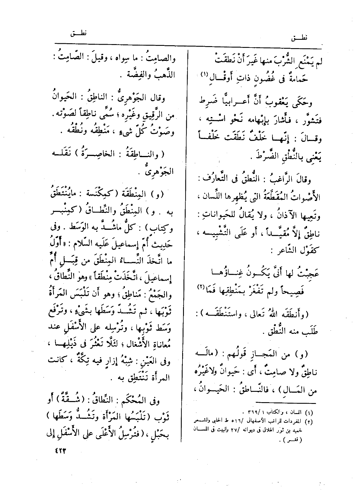 وَحكى يَعْقُوب أنّ أَعْرَابِيًا ضرِطَ فتشوّر، فَأَشَارَ بإبْهامِه نحْو اسْتِه، وَقَالَ: إنّها خلْفٌ نطَقَت خَلْفاً يعْني بالنُطْقِ الضّرْطَ. وَقَالَ الراغِبُ: النُطقُ فِي التّعارُف: الأصْوات المُقَطَّعةُ الَّتِي يُظهِرها اللِّسان، وتَعيها الآذانُ، وَلَا يُقال للحَيوانات: ناطِقٌ إِلَّا مُقيَّداً، أَو على التّشْبيه، كقوْل الشَّاعِر: