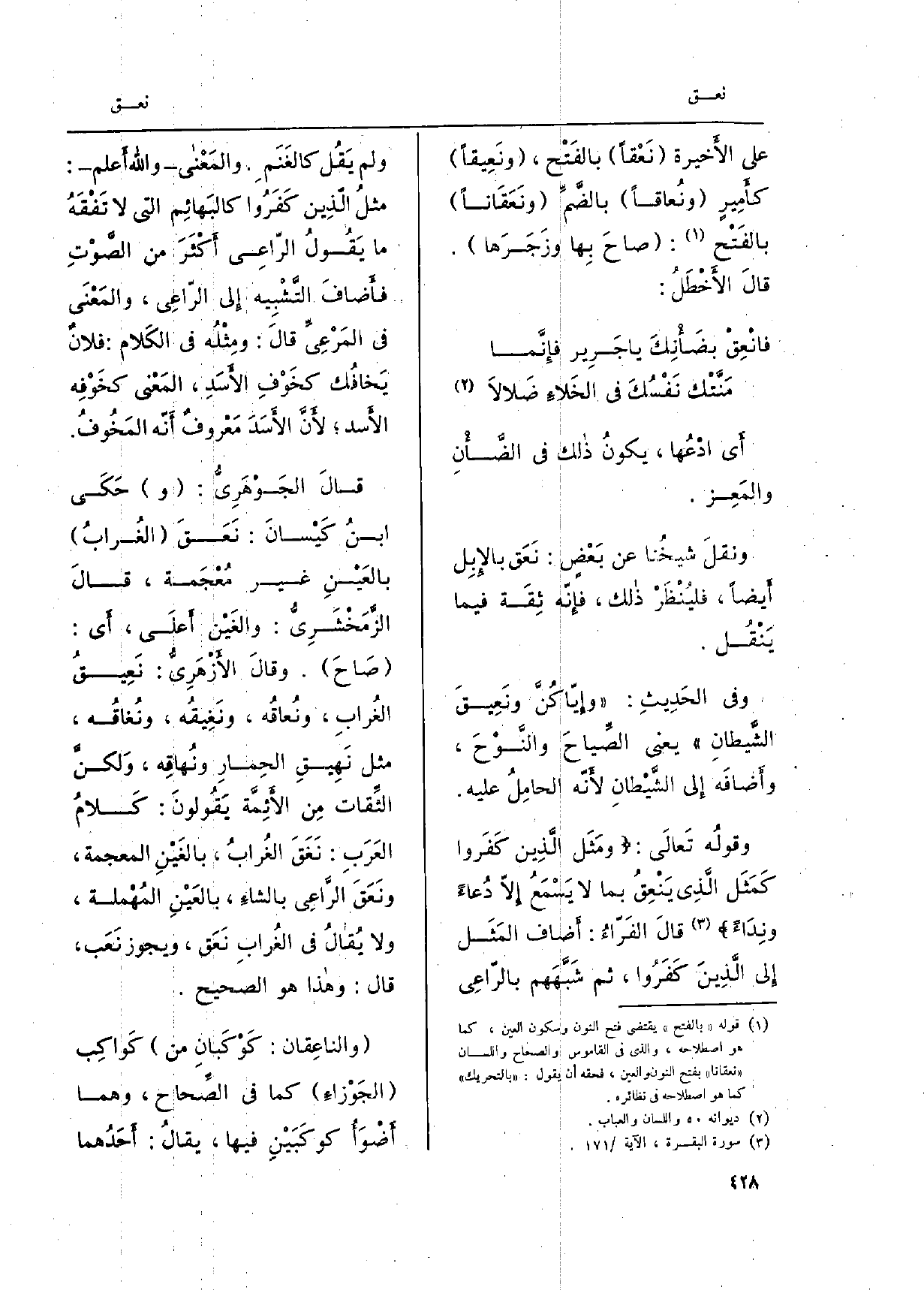 والمَعْنى وَالله أعلَم: مثلُ الَّذين كفَروا كالبَهائِم الَّتِي لَا تفْقَهُ مَا يقولُ الرّاعي أكْثَرَ من الصّوتِ فأضافَ التّشبيه الى الرّاعي، والمَعْنى فِي المرْعِيِّ قَالَ: ومثلُه فِي الكَلام: فلانٌ يخافُك كخوْفِ الأسَد، المعْنى كخَوْفِه الْأسد لأنّ الأسَدَ معْروفٌ أنّه المَخوفُ. قَالَ الجوهريُّ: وَحكى ابنُ كيْسانَ: نعَقَ الغُرابُ بالعيْن غير مُعْجَمة، قَالَ الزّمخْشَريّ: والغيْنُ أَعلَى، أَي: صاحَ. وَقَالَ الأزهريّ: نعيقُ الغُراب، ونُعاقُه، ونَغيقُه، ونُغاقُه، مثل نَهيقِ الحِمارِ ونُهاقِه، ولكنّ الثِّقات من الأئمّة يَقُولُونَ: كلامُ العرَب: نَغَقَ الغُرابُ، بالغيْنِ الْمُعْجَمَة، ونَعَقَ الرّاعي بالشاءِ، بِالْعينِ المُهْملة، وَلَا يُقال فِي الغُراب نَعَق، وَيجوز نعَب، قَالَ: وَهَذَا هُوَ الصّحيح. والناعِقان: كوْكَبانِ من كواكِب الجوْزاءِ كَمَا فِي الصِّحاح، وهما أضْوَأُ كوكَبَيْنِ فِيهَا، يُقَال: أحدُهما