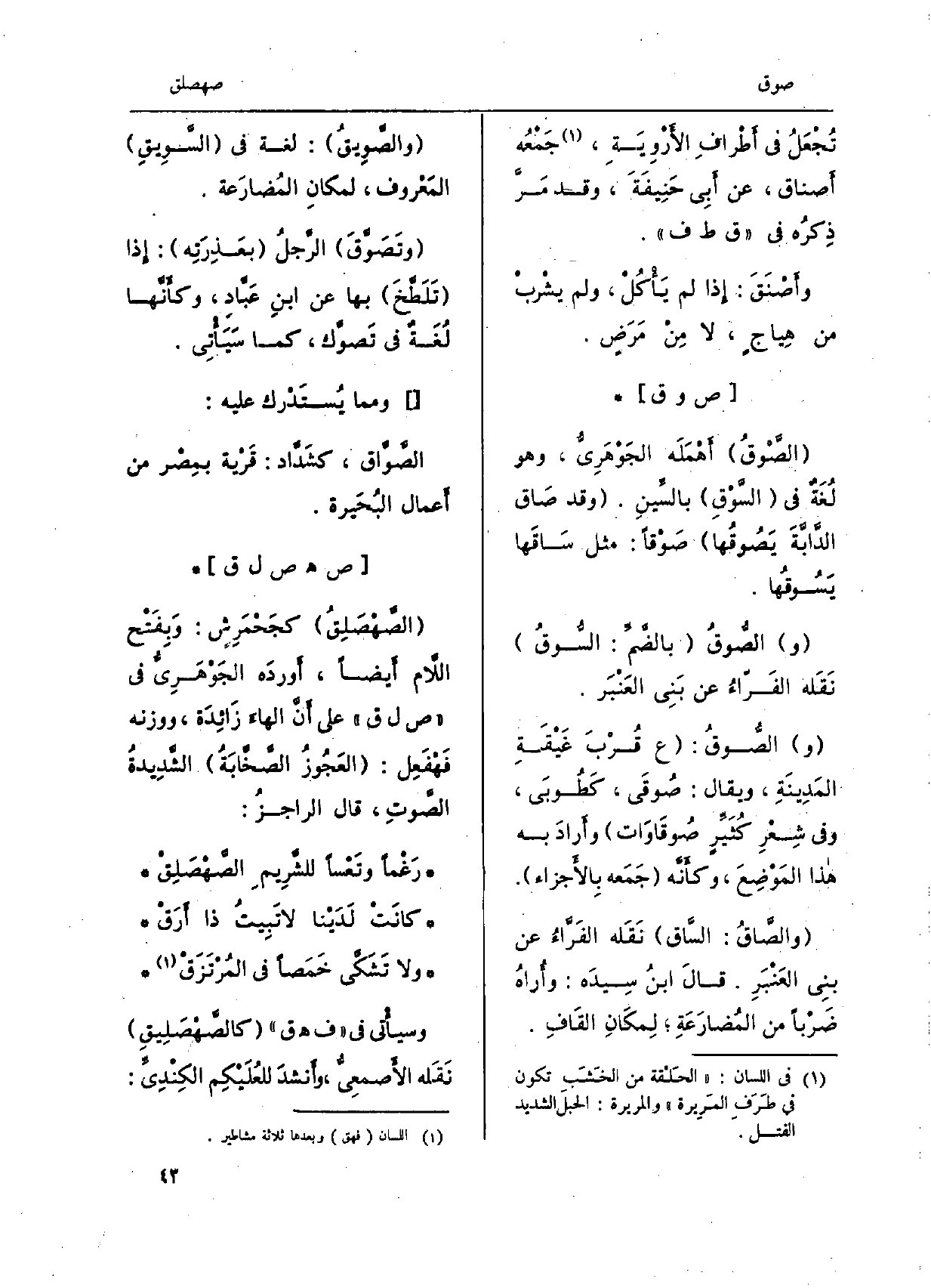 {الصّوْقُ أهْمَلَه الجوْهَريّ، وَهُوَ لُغةٌ فِي السَّوْقِ بالسّينِ. وَقد} صاق الدّابّةَ {يَصوقُها صَوْقاً: مثل ساقَها يَسوقُها. (و) } الصُّوقُ بالضّمِّ: السّوقُ نقَله الفَرّاءُ عَن بَني العَنْبَر. والصُّوقُ: ع قُرْبَ غَيْقَةِ المَدينةِ، وَيُقَال: {صُوقَى، كطُوبَى، وَفِي شِعْرِ كُثيِّرٍ} صُوقاوَات وأرادَ بِهِ هَذَا الموْضِعَ، وكأنّه جمَعه بالأجزاء. {والصّاقُ: السّاق نقَله الفَرّاءُ عَن بني العَنْبَر. قَالَ ابنُ سِيدَه: وأُراهُ ضرْباً من المُضارَعَة لمكانِ القافِ.} والصَّويقُ: لُغَة فِي السّويقِ المَعْروف، لمكانِ المُضارَعة. {وتصوّقَ الرّجلُ بعَذِرَتِه: إِذا تلطّخَ بهَا عَن ابنِ عبّاد، وكأنّها لُغةٌ فِي تصوّك، كَمَا سَيَأْتِي. وَمِمَّا يُستدْرَك عَلَيْهِ:} الصّوّاق، كشدّاد: قَرْيَة بمِصْر من أَعمال البُحَيرة.